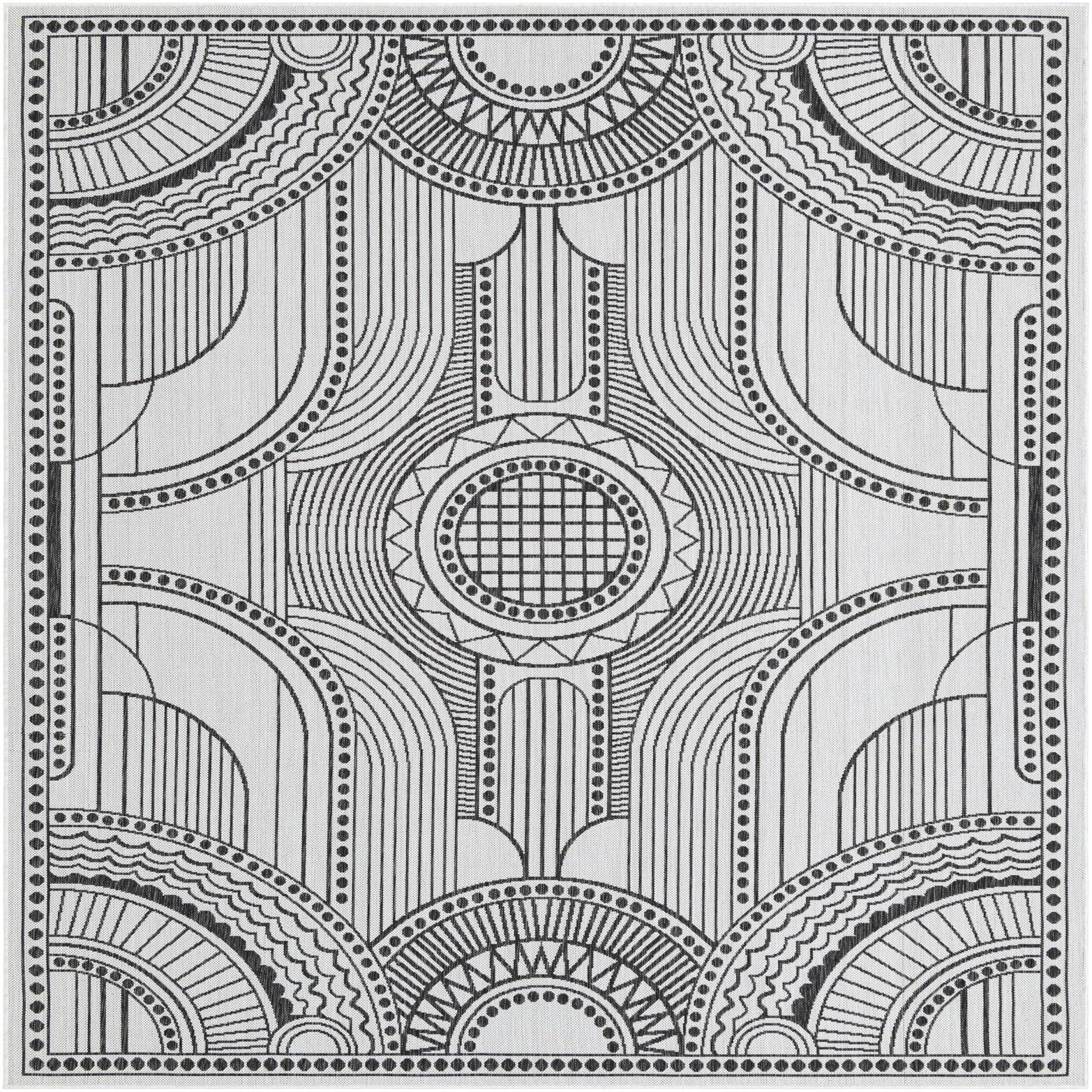 An 8x10 rectangular black and ivory contemporary rug with a medallion and geometric pattern, ideal for indoor or outdoor spaces.