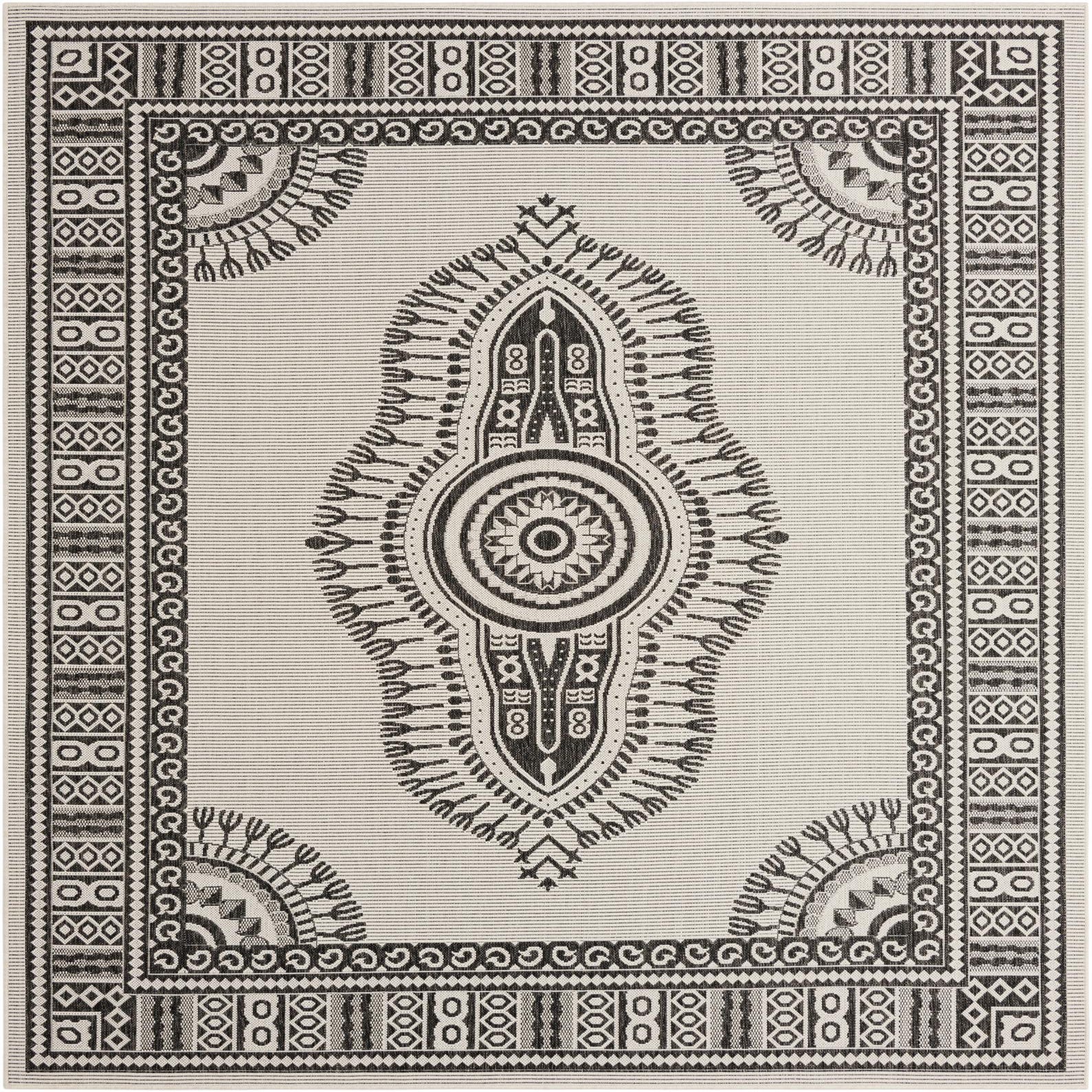 The contrasting monochromatic palette and classic design elements make this rug a versatile piece for a range of décor themes. It can complement traditional outdoor furniture, add a touch of elegance to modern minimalist settings, or stand as a focal point in a transitional patio arrangement. Its robust construction also makes it suitable for high-traffic areas such as dining spaces, play areas, or a covered porch.