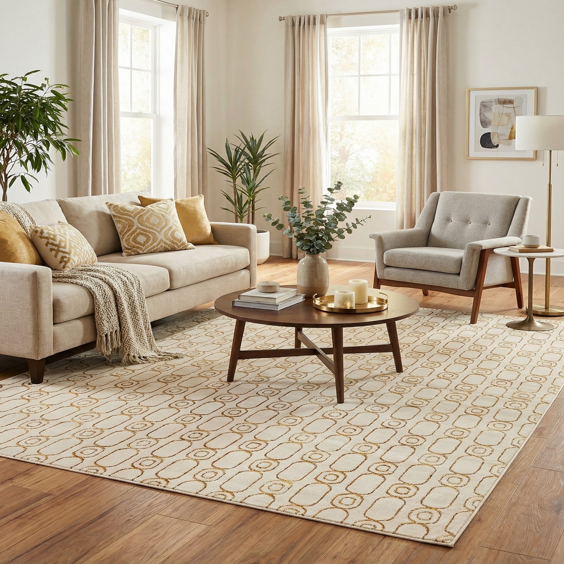 A repeating geometric pattern of linked ovals and small concentric rings is rendered in warm gold against a clean white field, creating a modern, mid-century inspired look. The machine-made construction (70% polypropylene, 30% polyester) uses a cut-and-loop technique so the gold pattern sits slightly raised above the smoother white background; run your hand across the surface and you’ll notice a gentle ridge where the design is, with a soft, low pile beneath that feels comfortable underfoot.