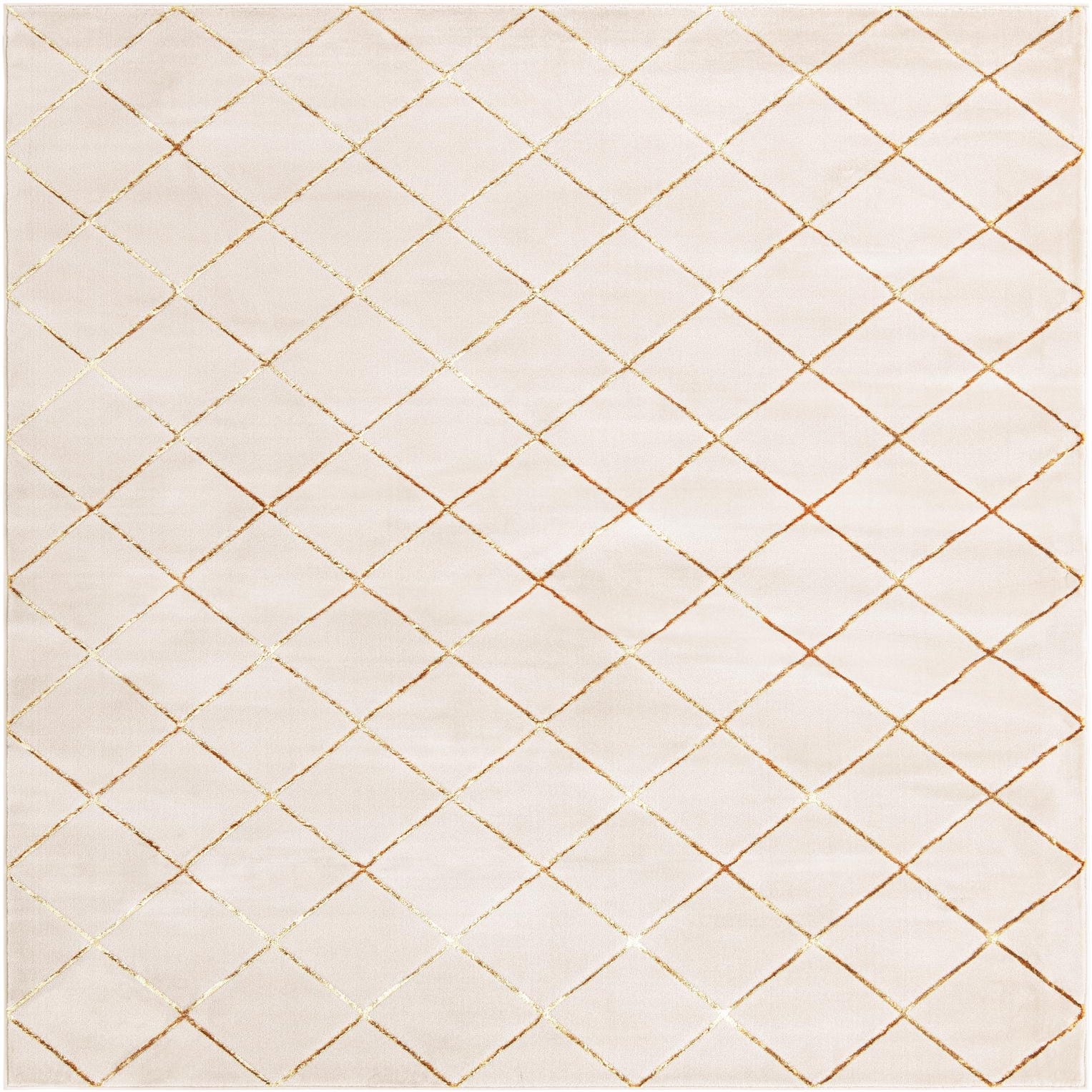 A soft white field is crossed by a loose, oversized diamond lattice in warm gold, creating a geometric pattern with a relaxed, handcrafted look. The gold lines have slightly uneven edges that add visual texture against the smooth background, giving the rug a contemporary, refined feel without being formal. Machine-made from 70% polypropylene and 30% polyester, the surface is soft to the touch with a gentle sheen that catches light and keeps the pattern crisp against the pale ground.
