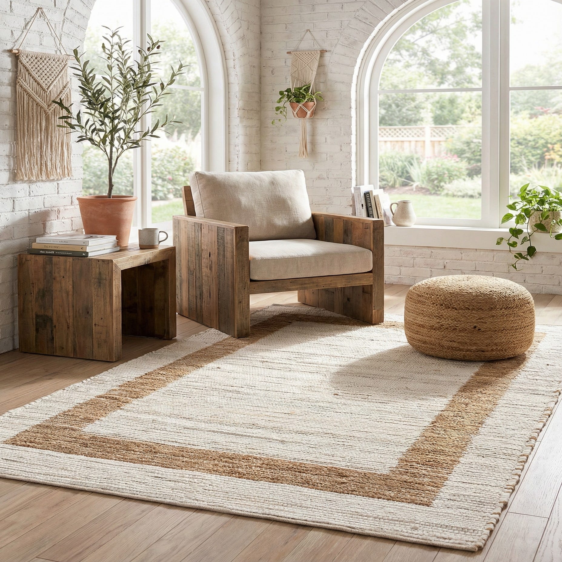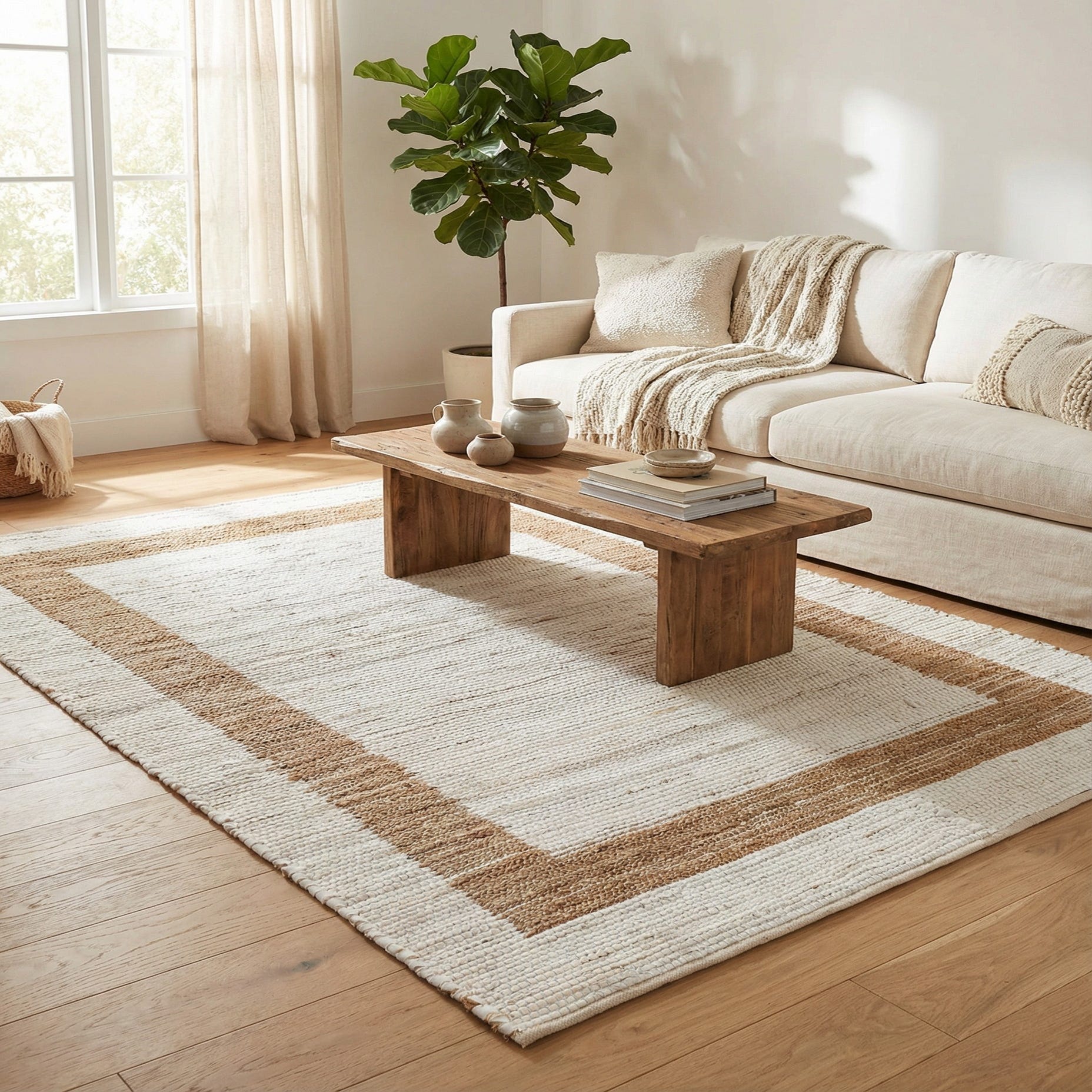 A clean, rectangular jute border frames a soft white-and-natural ground, creating a calm, minimalist profile that fits a range of interiors. The hand-woven construction of 60% cotton and 40% jute gives the surface a low, flat texture with a gentle, tactile contrast: the cotton provides a smooth, slightly cushioned base while the jute border adds a nubbly, organic feel and visual warmth. Subtle variations in the weave and natural fiber tones bring a handcrafted character without overwhelming the simple, geometric layout.