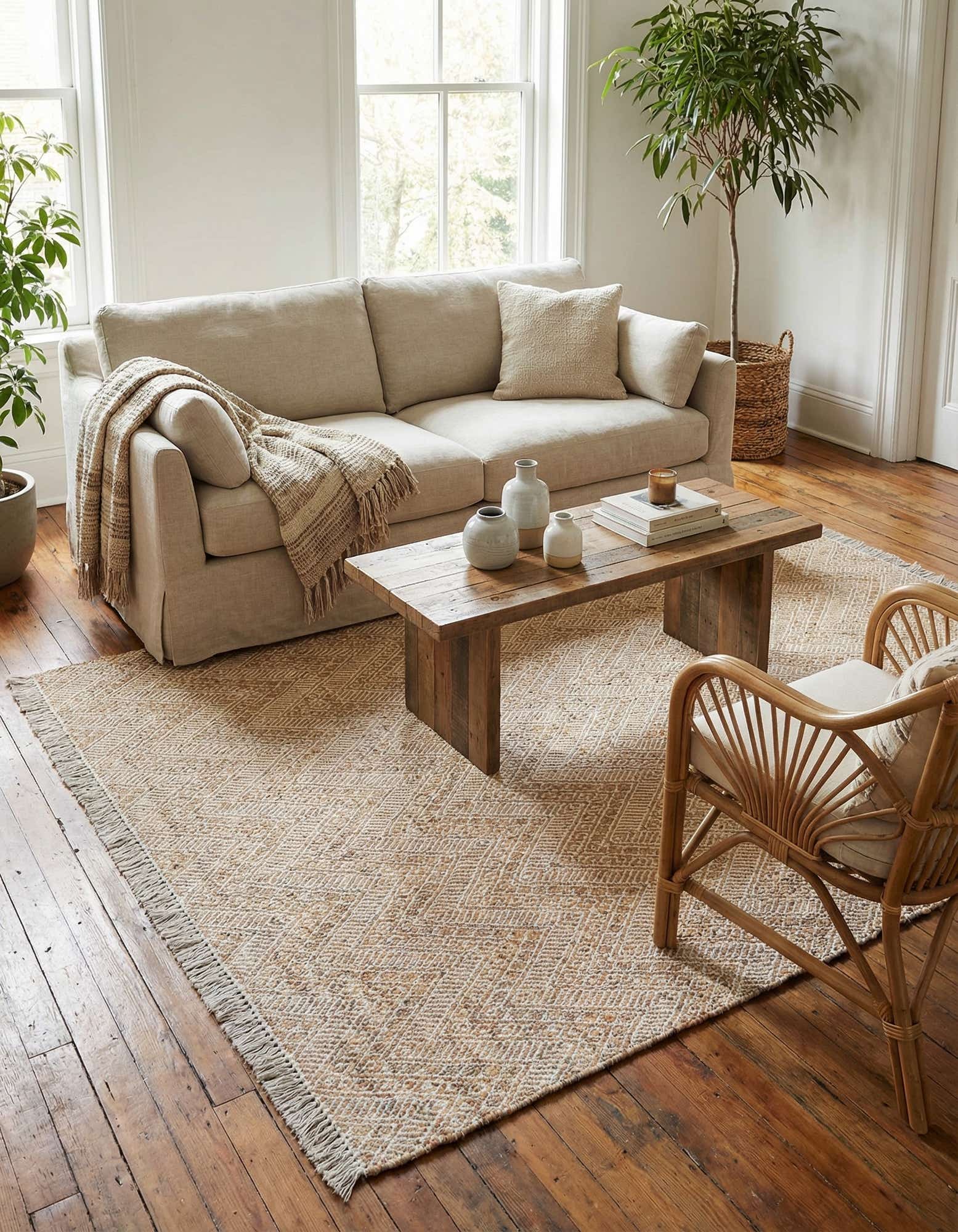 The pattern works well in relaxed, contemporary settings: place it under a coffee table in a sunlit living room, layer it in a coastal or cottage bedroom, or center it in an entryway to anchor neutral décor. Its neutral tones and tactile weave pair easily with weathered wood, wicker, linen upholstery, or mixed-metal accents, making it a versatile foundation for Scandinavian, farmhouse, or modern-boho interiors.