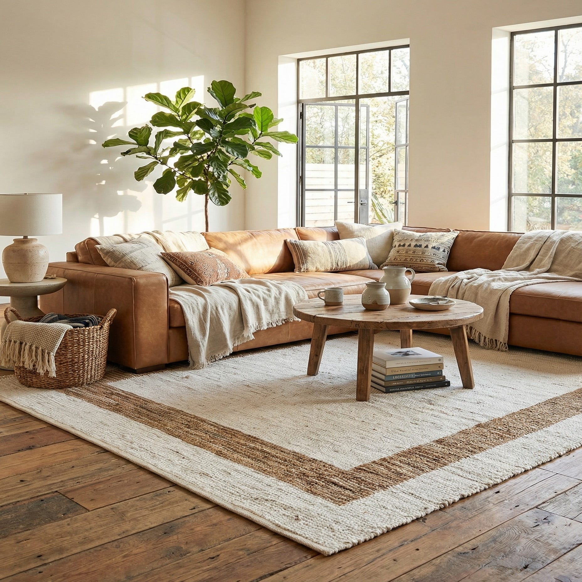 This rug works well in relaxed, contemporary interiors where texture and neutral color are the focus. Use it to define a living room seating area beneath a low-profile sofa, anchor a dining space under a casual wood table, or layer it in a bedroom for added warmth beneath the bed. It pairs naturally with unfinished or warm wood floors, rattan and wicker furniture, linen upholstery, and matte black or brass accents for a balanced, modern-farmhouse or coastal-Scandi look.