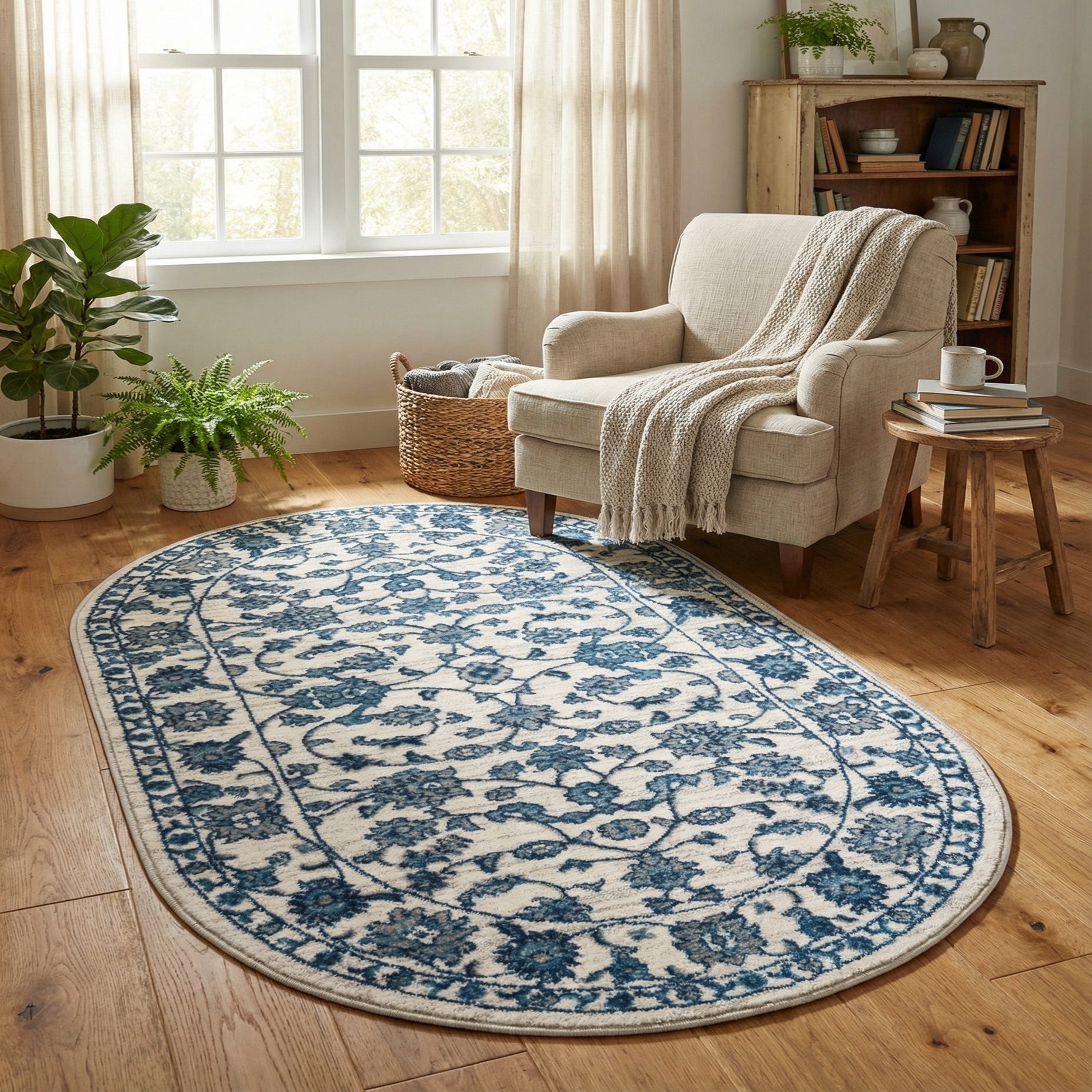 A traditional Persian-inspired floral medallion unfolds across a White Blue ground, with blue and gray blossoms and scrolling vines arranged inside a narrow floral border. The oval shape emphasizes the central pattern while the muted two-tone palette keeps the look calm and versatile. Machine made of 55% polypropylene and 45% polyester, the rug has a close, low-profile pile that feels soft underfoot; the weave produces a subtle ribbed texture and gentle variation in tone that gives the pattern a quietly aged character.