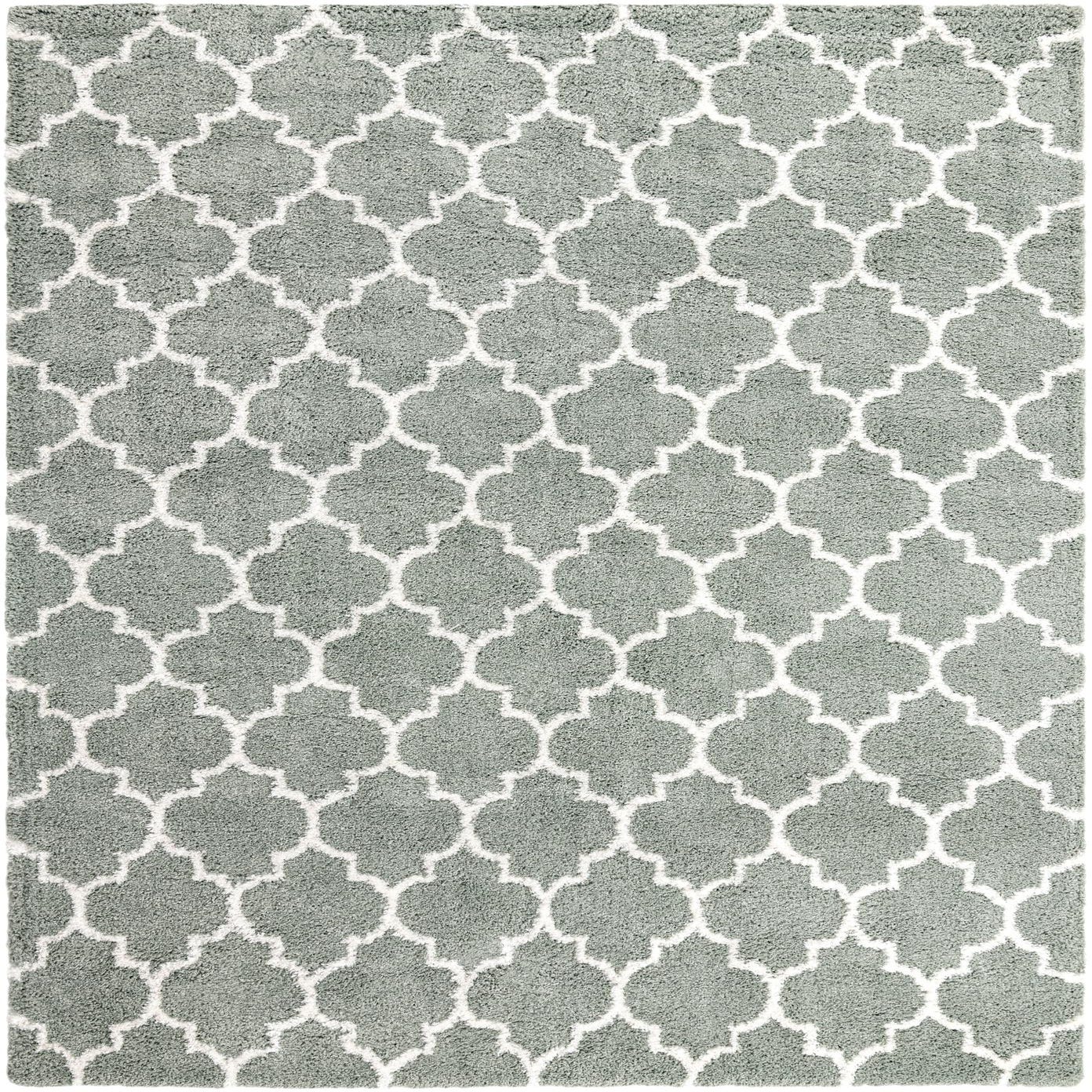 A soft, shag pile in a cool white-cyan field cushions an allover Moroccan trellis of ivory quatrefoils, creating a graphic yet gentle surface. The raised ivory pattern adds subtle depth and a tactile contrast against the plush, dense pile—running your hand across it reveals a cushiony, slightly springy texture typical of machine-made shag construction. The overall effect is relaxed and refined, with the pale cyan base bringing a muted, coastal-leaning color note that pairs cleanly with light woods and neutral textiles.