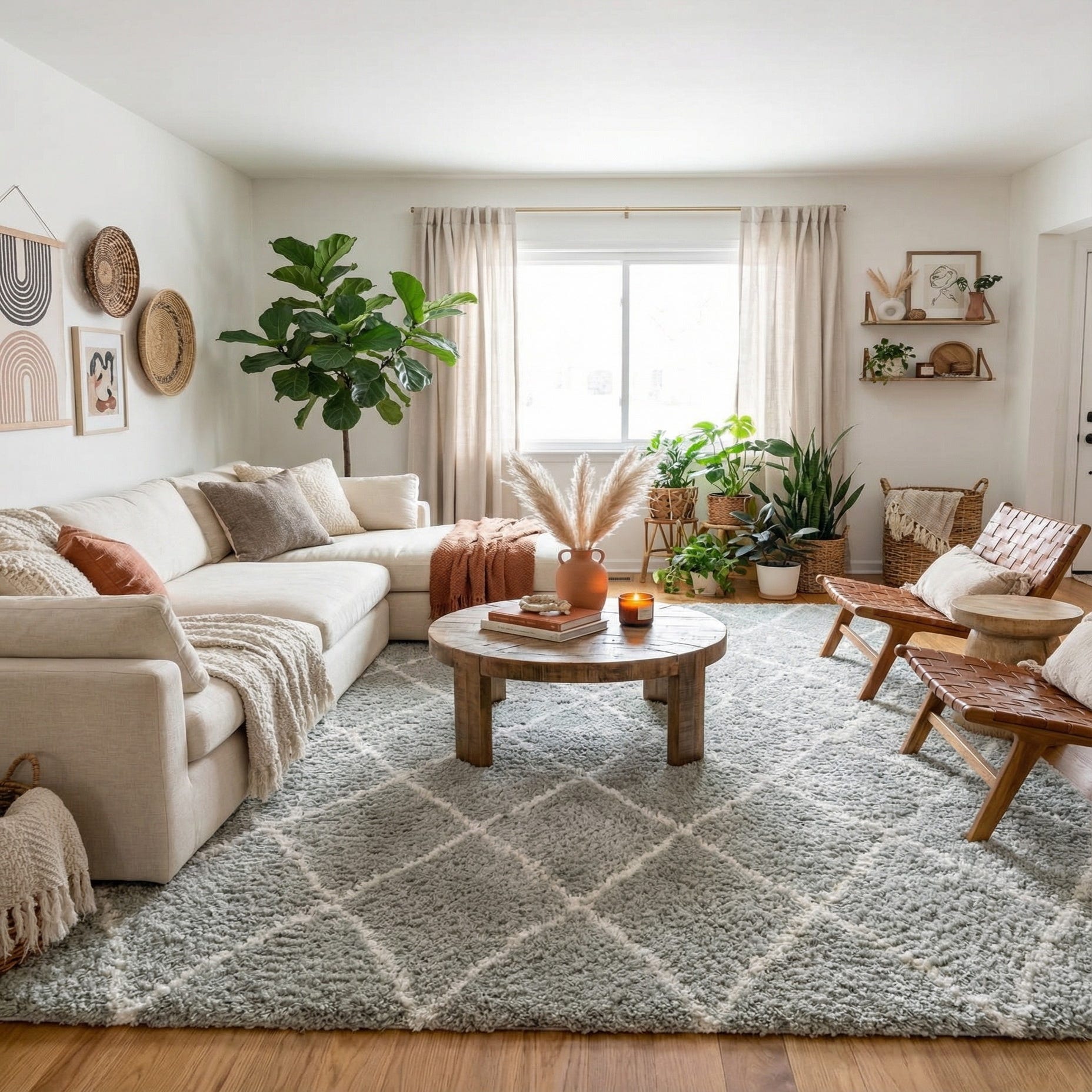Use this rug to anchor a living room seating area beneath a low-profile sofa, layer it in a bedroom for added warmth, or place it in a reading nook or nursery where a soft surface is desirable. It pairs naturally with light wood furniture and neutral linens, and fits a range of styles from Scandinavian minimalism and coastal casual to modern boho when combined with woven textures and simple, warm accents.