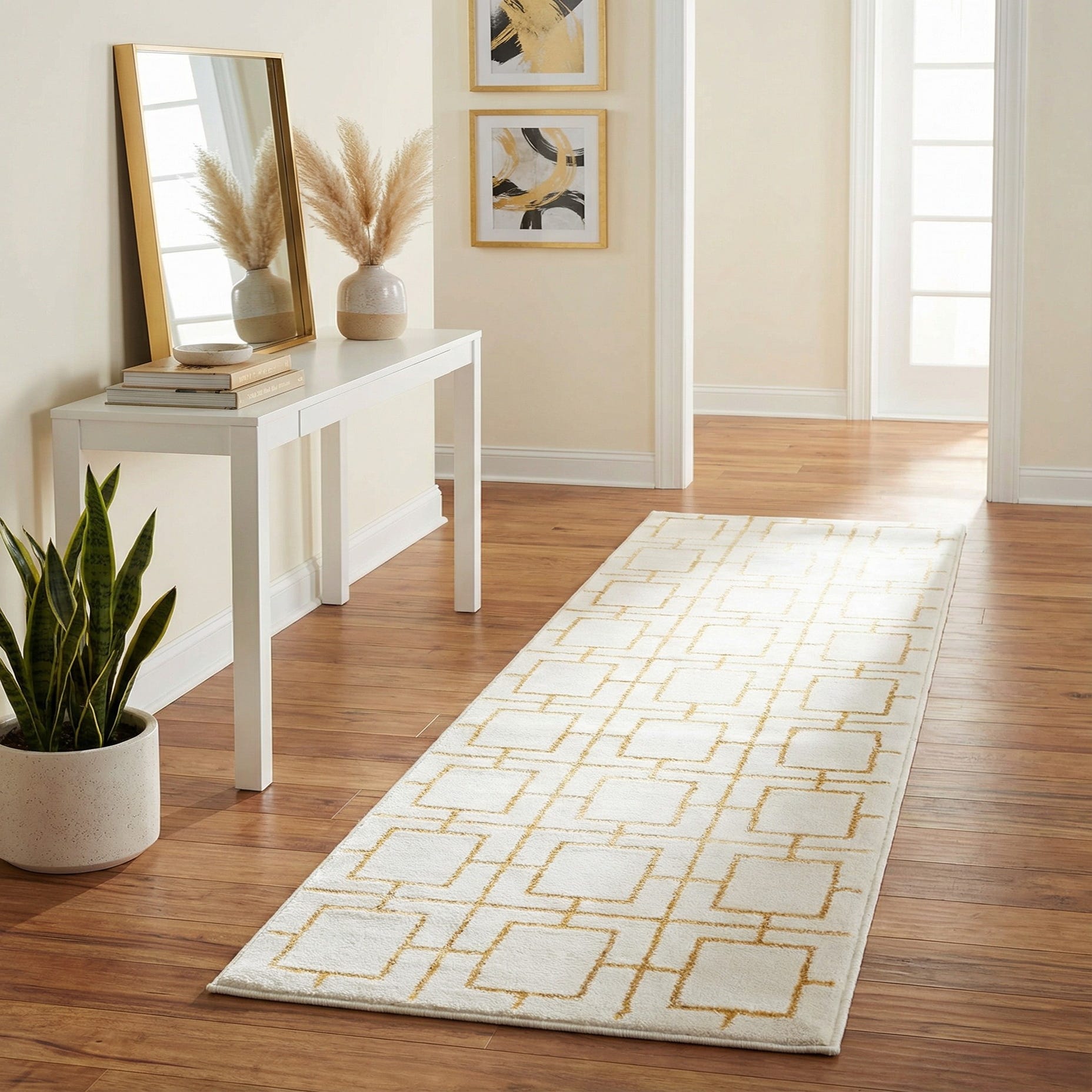 Perfect for hallways, entryways, or alongside a bed, this runner complements modern glam and transitional interiors as well as mid-century modern schemes. Pair it with warm metallic accents, mirrored or brass furniture, and light wood or marble floors to emphasize the Gold highlights, or layer it under simple, neutral furnishings to introduce pattern without overwhelming the space.
