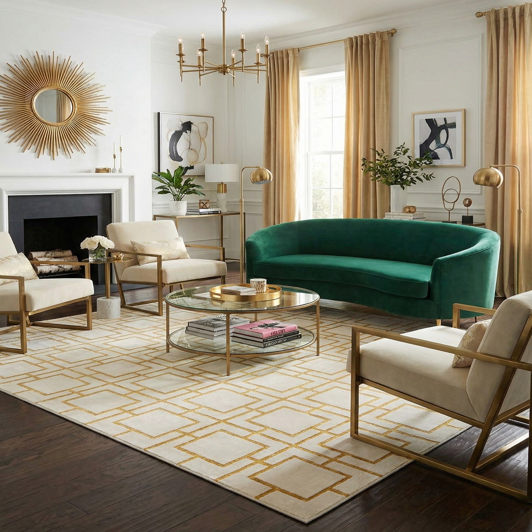 This rug works well in contemporary glam, mid-century modern, or transitional interiors—pair it with brass accents, neutral upholstery, and glass or mirrored surfaces to highlight the metallic tones. Use it to anchor a living room seating area, refine a formal dining space, or add a polished layer to a master bedroom where a light, luminous base and geometric pattern bring cohesion to the room.