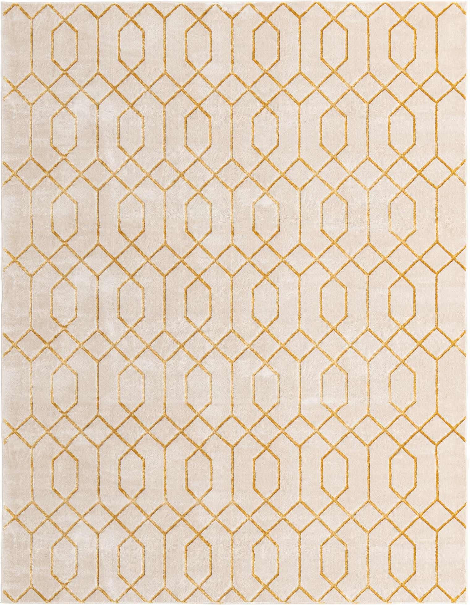 A 10x13 rectangular white area rug with a raised gold trellis pattern, suitable for a modern living room.