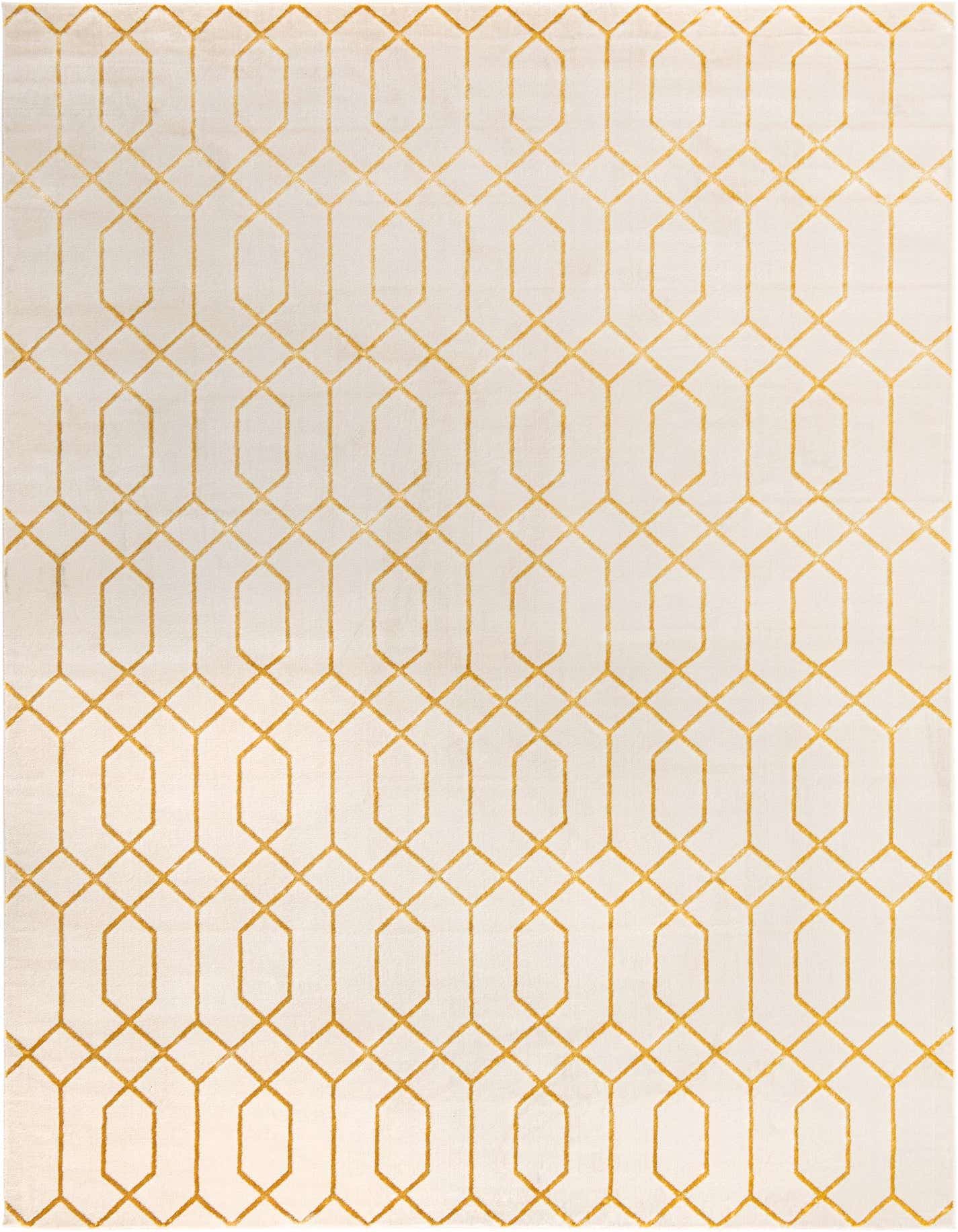A crisp geometric trellis runs across a White Gold field, the pattern formed by linked elongated octagons and small diamond nodes in a warm Gold. The contrast between the light background and the gold lines gives the rug a tailored, modern look with a hint of vintage-inspired geometry. Machine made of 70% polypropylene and 30% polyester, the face has a soft, slightly cushioned feel; the polyester fibers introduce a gentle sheen while the polypropylene provides a smooth, resilient finish you can feel underfoot.