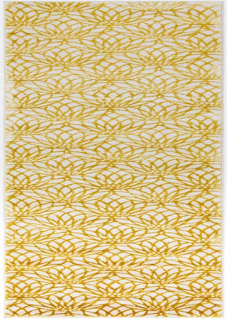 A repeating trellis of stylized floral motifs sweeps across a White Gold field, creating a rhythmic, modern pattern that reads both architectural and organic. The design is rendered in a warm golden-yellow tone that sits slightly raised against the light background, giving the surface a subtle high-low texture you can feel beneath your feet. Machine made from 70% polypropylene and 30% polyester, the pile has a soft, slightly plush hand with enough structure to hold the pattern’s crisp edges and maintain a neat appearance in active spaces.