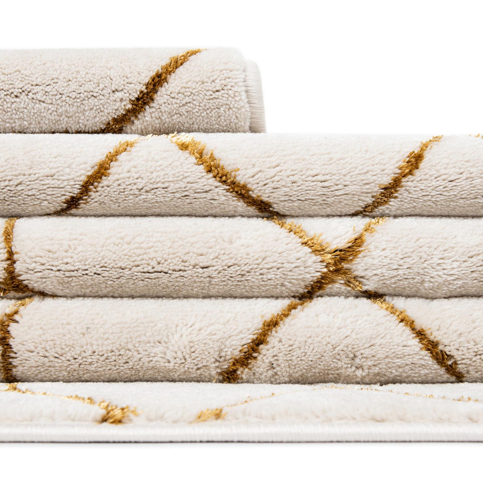A refined trellis pattern of interlocking elongated hexagons and diamond shapes moves down the length of this runner in a warm gold against a White Gold background. The raised gold motif contrasts gently with the pale field, creating a subtle dimensional effect without overwhelming the eye. Machine made from 70% polypropylene and 30% polyester, the surface feels soft underfoot with a low, slightly lustrous pile where the polyester fibers catch the light and the polypropylene provides a smooth, resilient base.