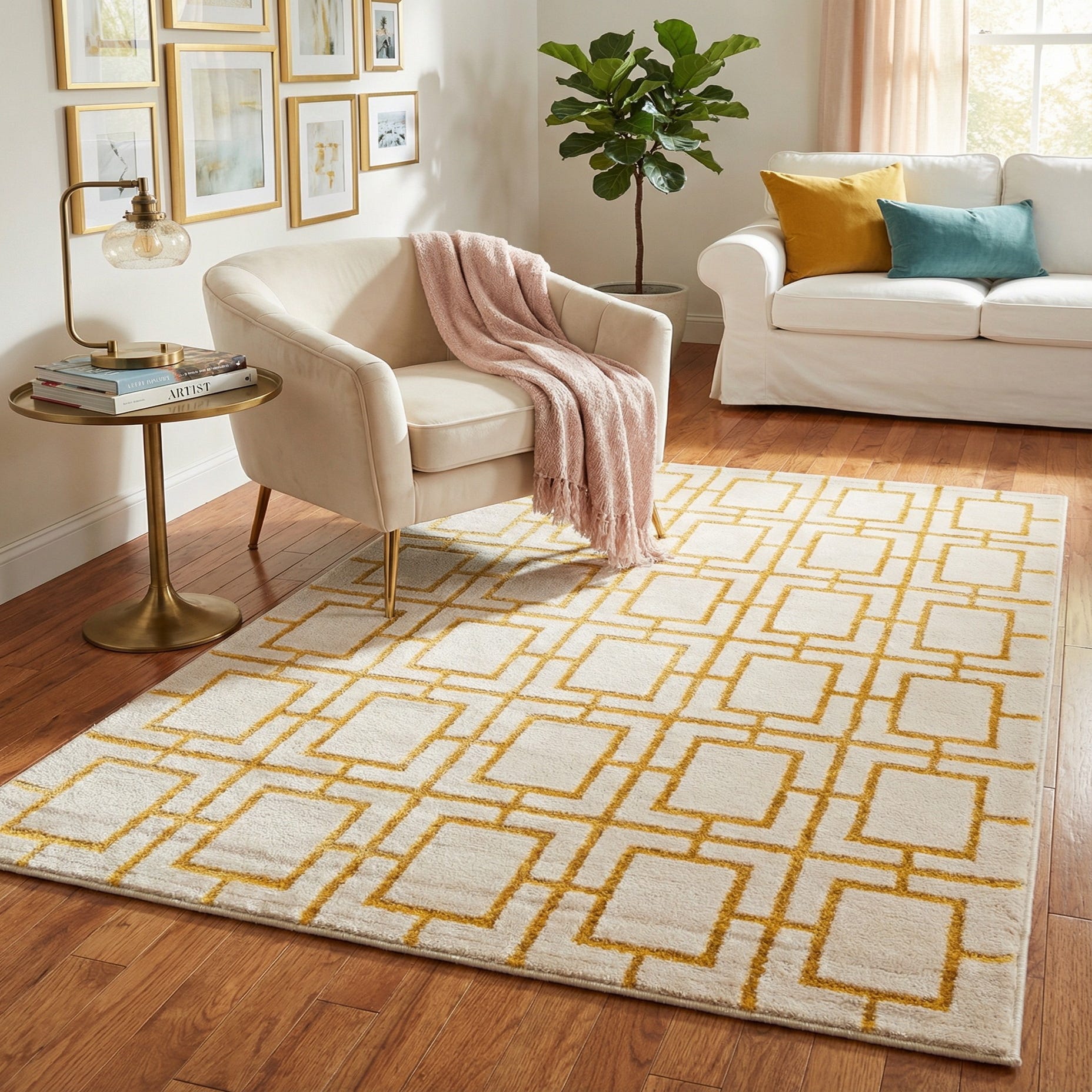 A soft White Gold field is laid out in a crisp geometric trellis of Gold rectangular outlines, forming a clean, repeating lattice that reads modern with a touch of glam. The pile has a velvety hand that feels plush underfoot, while the slightly raised Gold motifs add subtle depth and texture you can both see and feel. Machine made from 70% polypropylene and 30% polyester, the rug keeps the pattern sharp and the surface smooth to the touch.