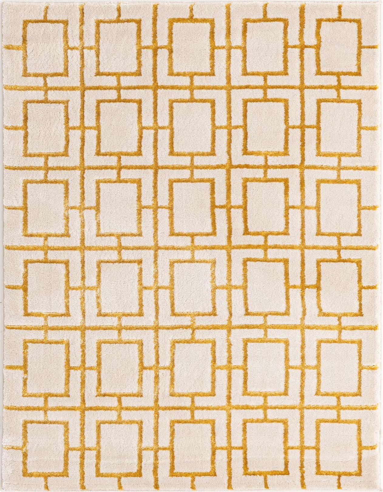A soft White Gold field is laid out in a crisp geometric trellis of Gold rectangular outlines, forming a clean, repeating lattice that reads modern with a touch of glam. The pile has a velvety hand that feels plush underfoot, while the slightly raised Gold motifs add subtle depth and texture you can both see and feel. Machine made from 70% polypropylene and 30% polyester, the rug keeps the pattern sharp and the surface smooth to the touch.
