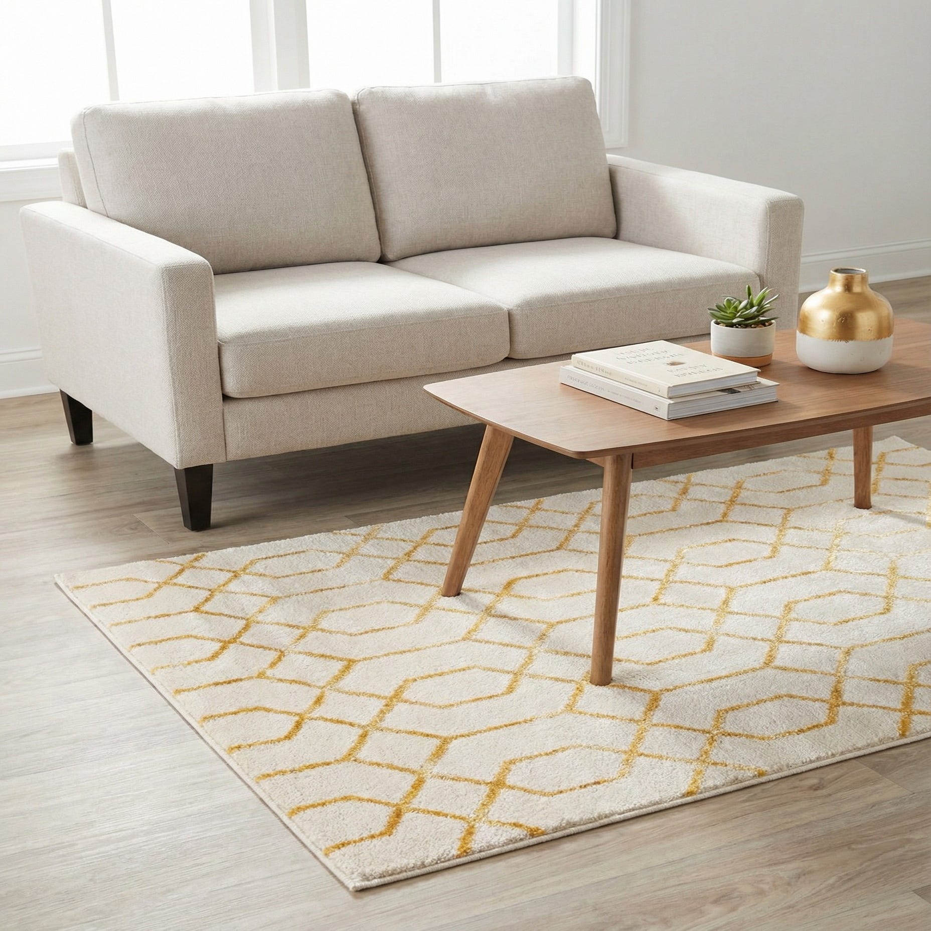 This rug works well in a range of interiors: place it under a small coffee table in a compact living room, layer it in a bedroom for added warmth at the foot of the bed, or set it in an entryway to welcome guests. The Gold accents pair naturally with brass hardware and warm wood tones, and the neutral White Gold background complements both clean, modern furnishings and more traditional pieces that can benefit from contemporary pattern.