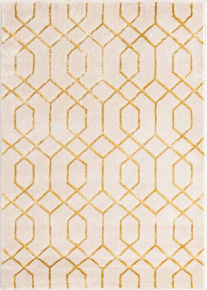 A warm White Gold field grounds a repeating trellis of soft Gold lines, forming elongated hexagons with slightly irregular, hand-drawn edges. The geometric pattern reads modern yet approachable, and the raised gold motif adds a gentle textural contrast against the smooth background. Machine-made from 70% polypropylene and 30% polyester, the rug has a consistent, slightly plush surface with a subtle sheen, offering a comfortable underfoot feel and clear pattern definition.