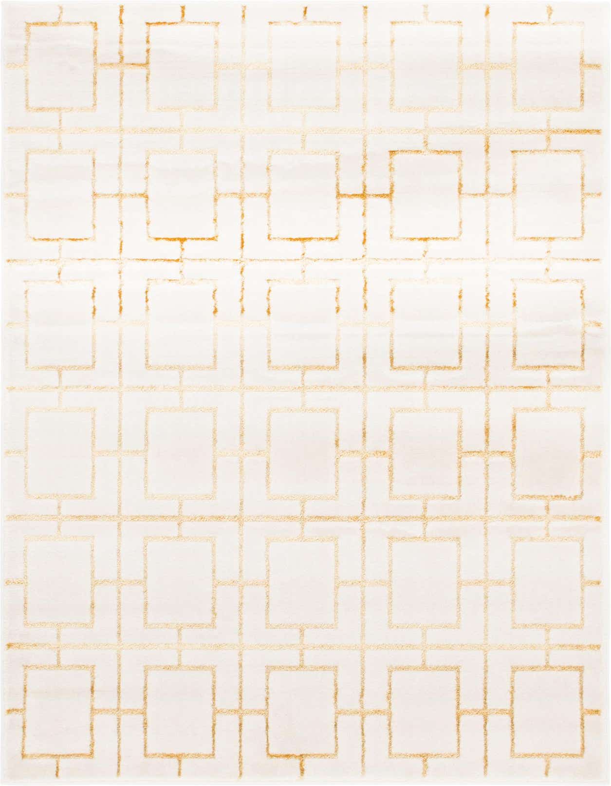 A soft White Gold field sets a luminous stage for a clean, geometric trellis of warm Gold rectangles. The pattern is a modern take on classic latticework — evenly spaced, rectangular blocks linked by slender lines that create a measured, rhythmic grid. The Gold outlines have a gently brushed surface that catches light differently than the ground, giving the rug a restrained, glamorous look without overwhelming the room.