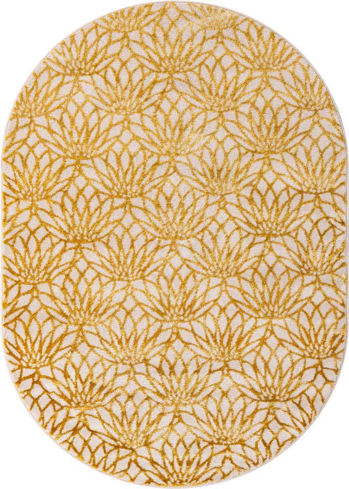 An oval 4'x6' white area rug with a repeating gold Hollywood Glam floral trellis pattern, featuring a textured pile.
