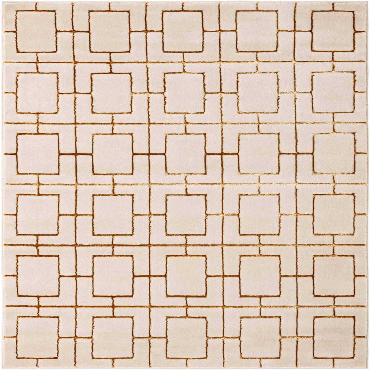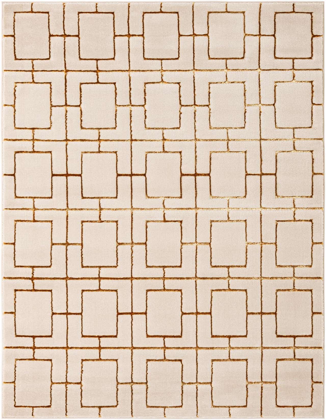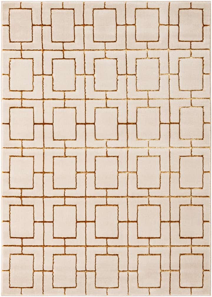 A clean, geometric trellis of rectangular motifs in warm gold sits crisply against a White Gold field, creating a structured, modern pattern with a nod to vintage glam. Machine made from 70% polypropylene and 30% polyester, the rug has a soft, low-pile background with slightly elevated, lustrous gold outlines that add subtle dimension and a gentle sheen you can feel underfoot. The contrast between the matte White Gold field and the reflective Gold accents keeps the look refined and tactile.