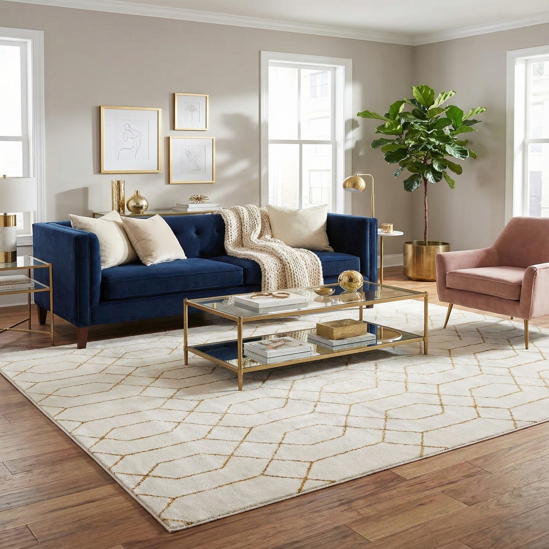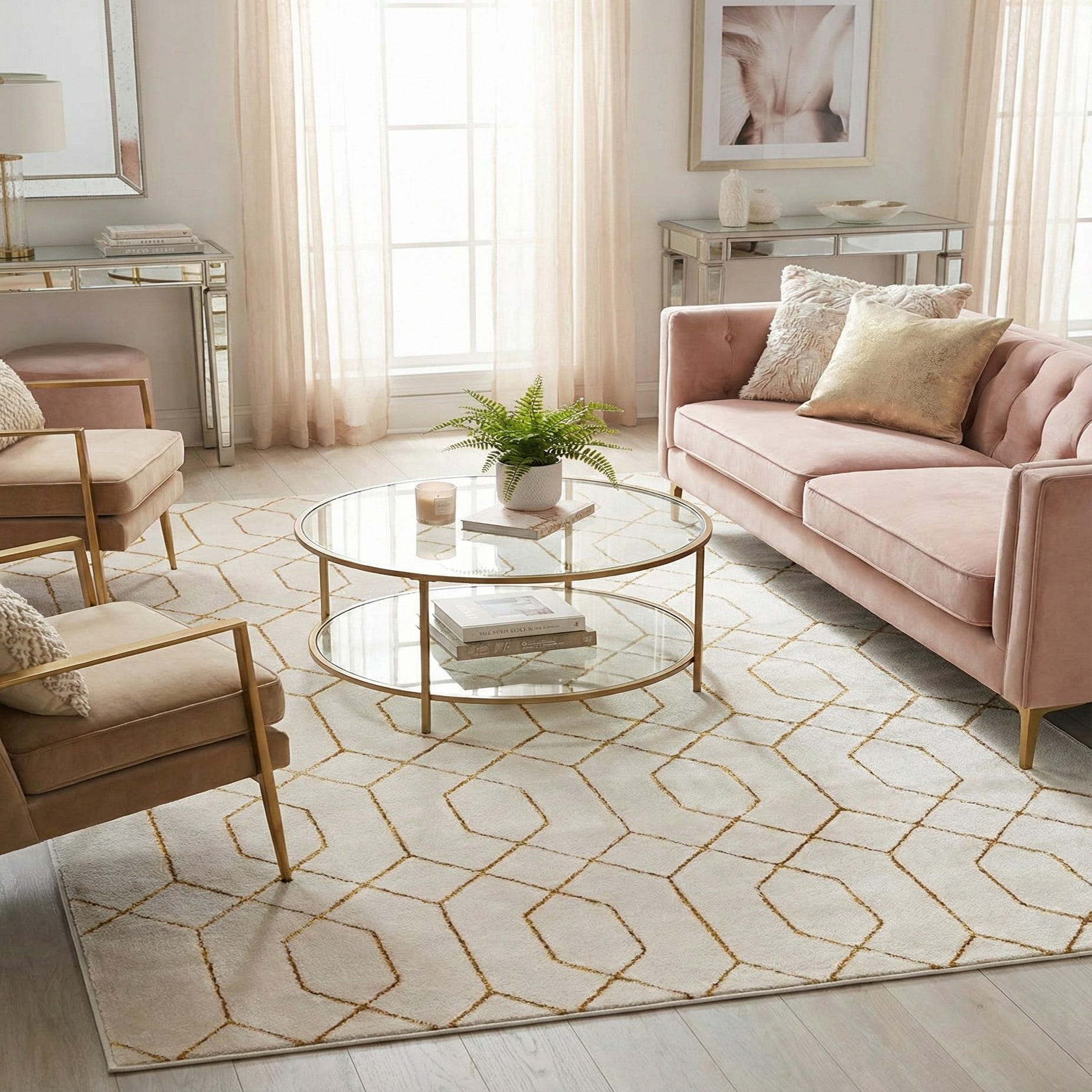 This piece works well in contemporary and transitional interiors where a restrained glam element is desired — think a living room layered beneath a coffee table, a bedroom anchoring a bed, or an entryway that sets an elegant tone. It pairs especially well with warm wood finishes, brass or gold hardware, and neutral upholstery, and will complement minimalist rooms that benefit from a hint of pattern or more ornate spaces that need a simple, tying element.
