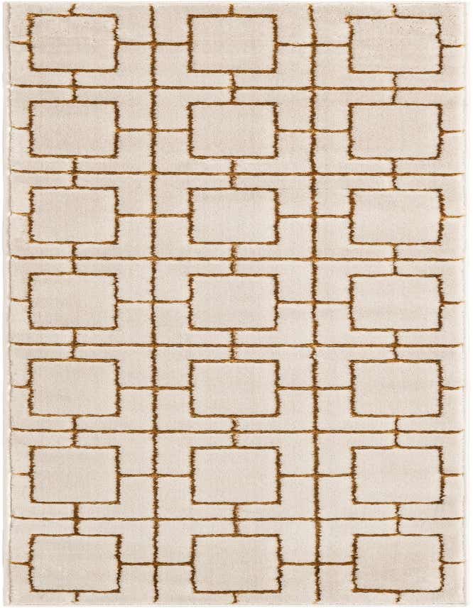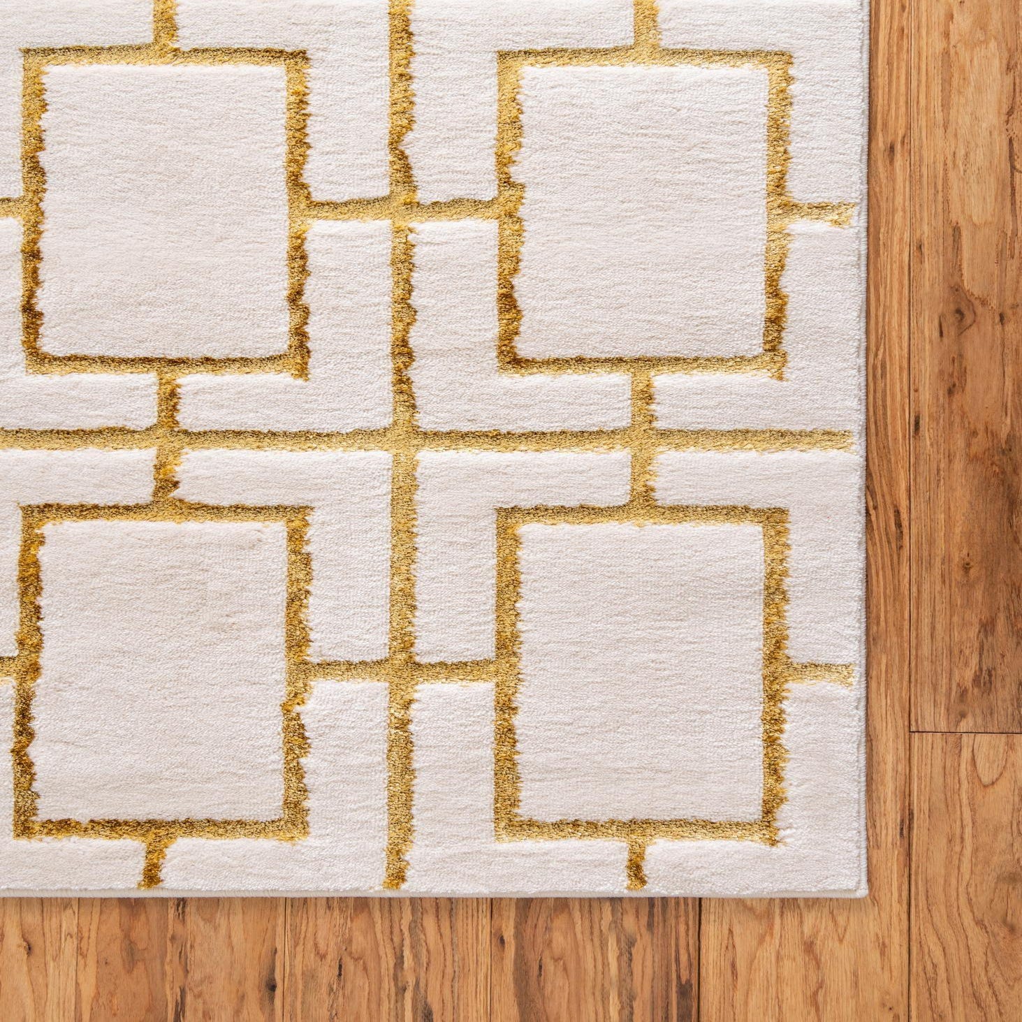 A linear trellis of linked rectangles in warm Gold runs across a White Gold field, forming a tidy, repeating geometric pattern with a modern-glam sensibility. The Gold outlines are slightly raised and catch light with a soft sheen, while the White Gold background has a velvety, even surface that invites bare feet. Machine made of 70% polypropylene and 30% polyester, the rug balances a plush hand with a subtle luster on the metallic-toned accents.