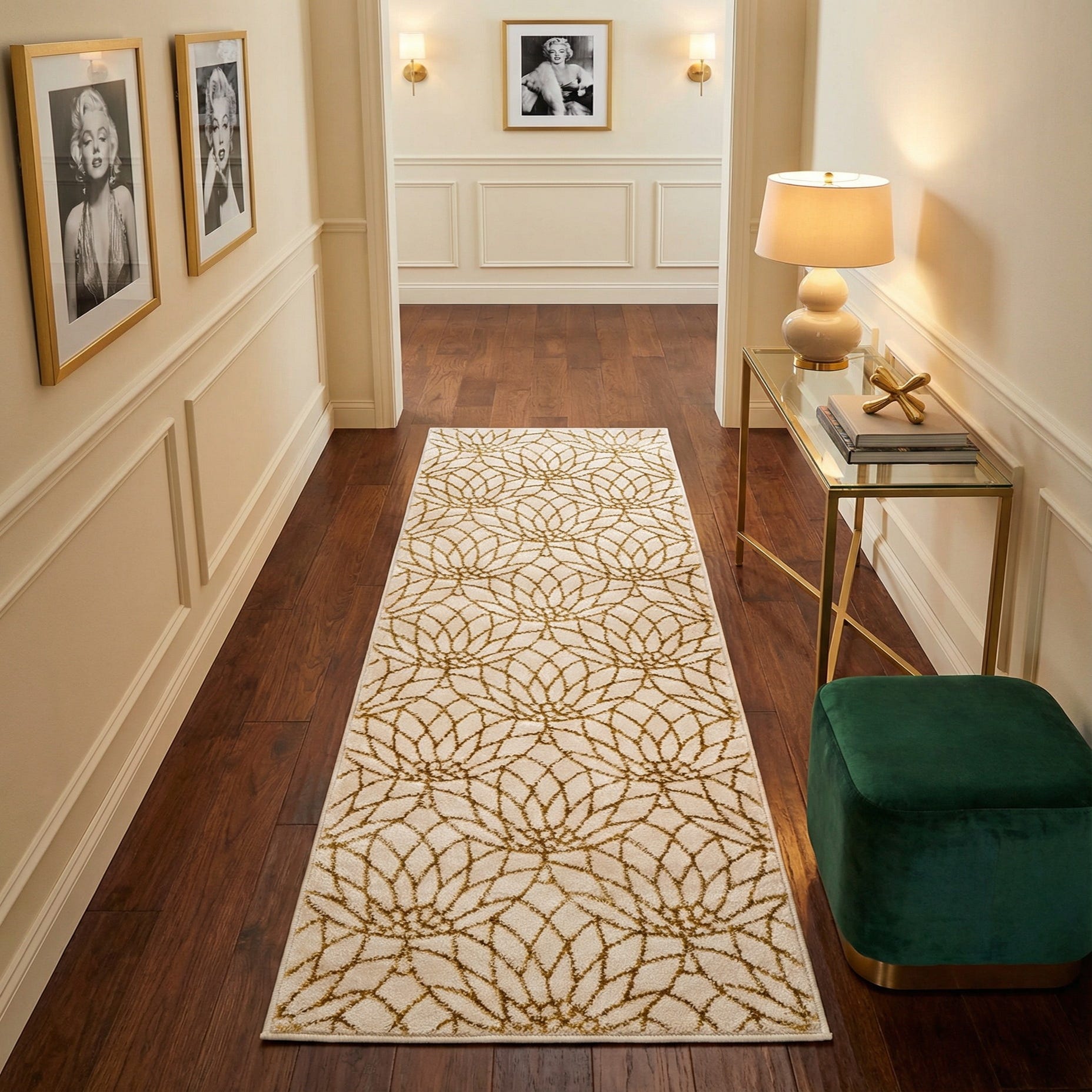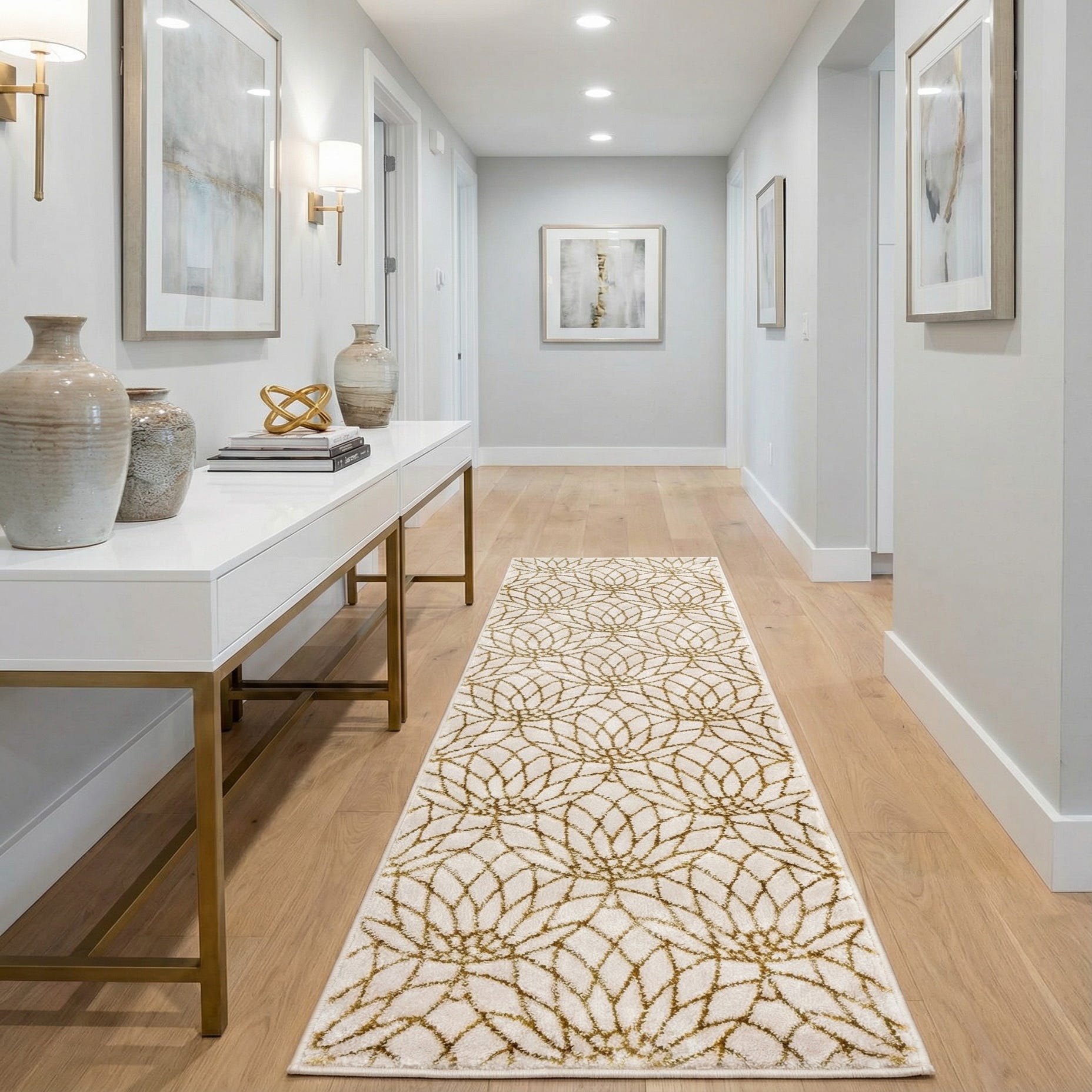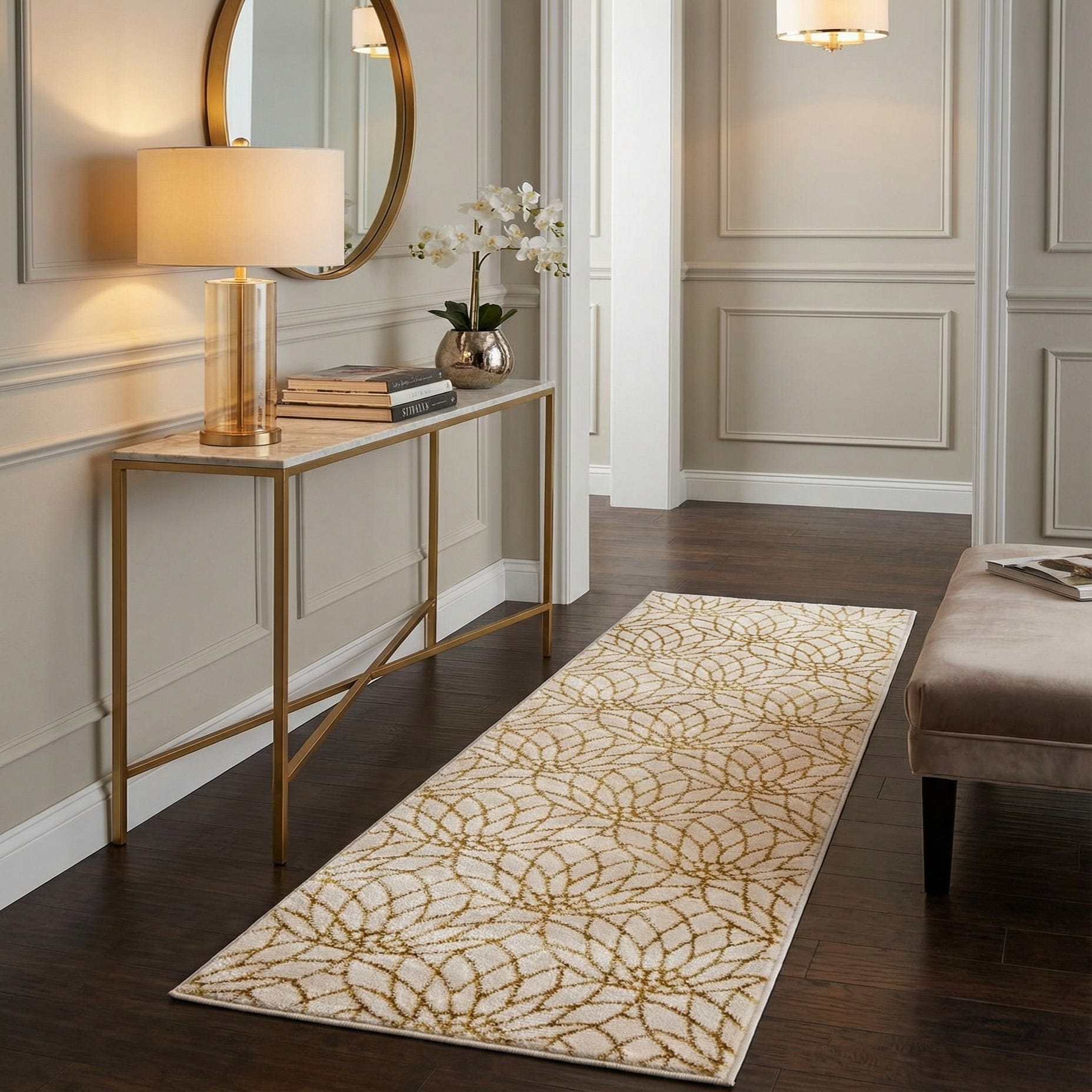 Machine made from 70% polypropylene and 30% polyester, this runner lays flat and holds its shape, making it well suited for hallways, narrow entryways, a kitchen galley, or alongside a bed. It pairs naturally with warm wood floors and brass or gold hardware, and works equally well in contemporary glam, transitional, or mid-century inspired interiors. Use it to add a touch of shimmer to a neutral palette or to coordinate with gold accents in furniture and lighting for a cohesive, polished look.
