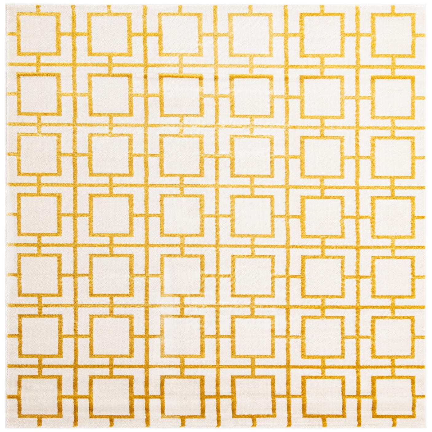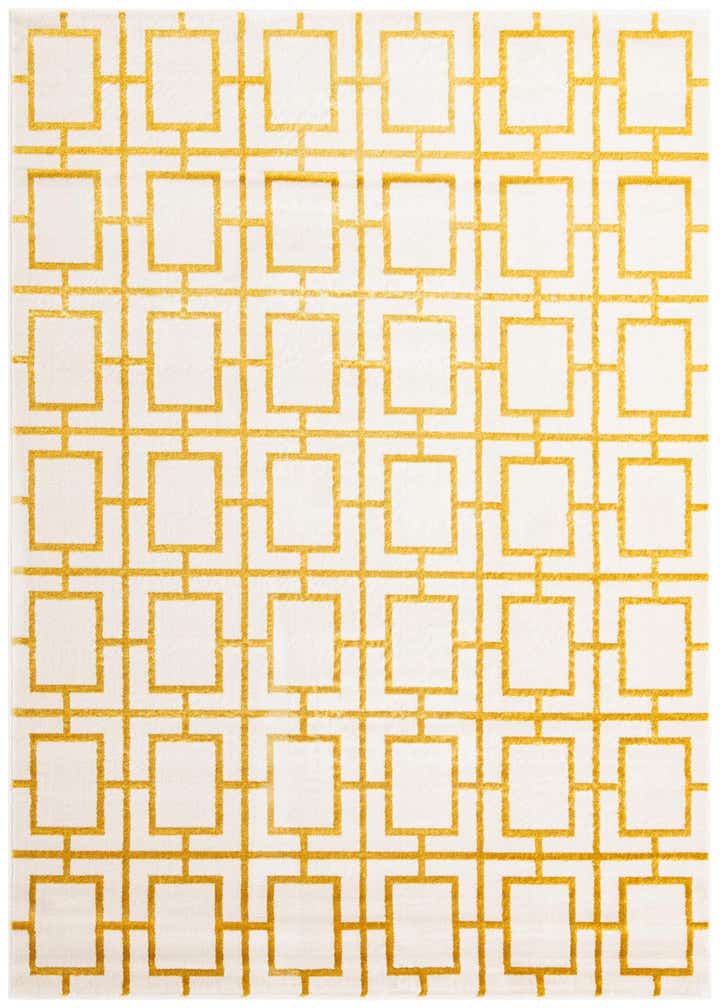 A crisp geometric trellis of linked rectangles in warm Gold sits against a White Gold field, giving this rug a clean, contemporary look with a touch of glam. The machine-made construction and a 70% polypropylene / 30% polyester blend produce a soft, slightly plush surface with a low-profile pile and a gentle sheen from the polyester yarn. The gold pattern is bold yet restrained, creating clear lines and negative space that work well as a visual anchor without dominating a room.