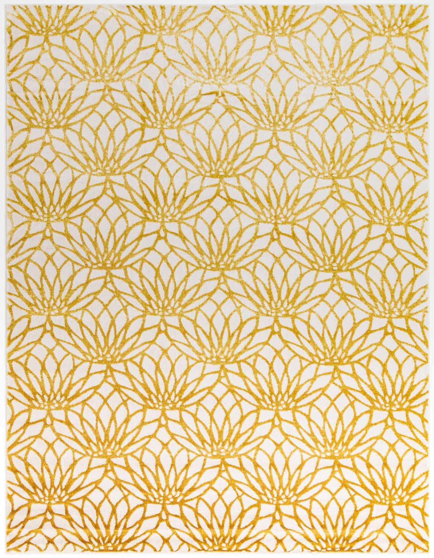 A 7x10 rectangular white area rug featuring a repeating gold floral trellis pattern with a textured pile.