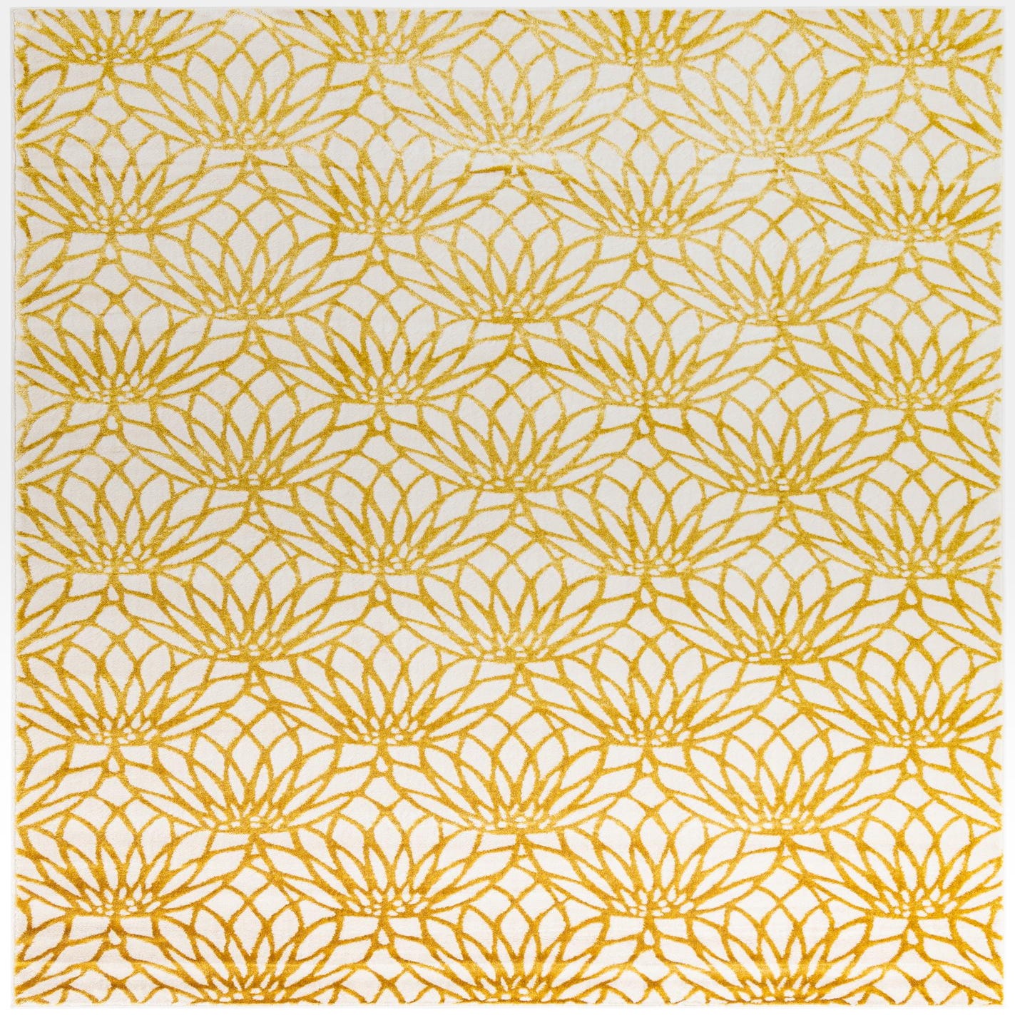 A repeating trellis of stylized floral motifs creates a bold, allover pattern on a White Gold background. The golden pattern has a slightly raised texture against the lighter field, offering a gentle dimensional feel underfoot and a subtle sheen from the polyester fibers. The overall look reads modern-glam with a decorative, geometric rhythm that adds visual interest without dominating the room.