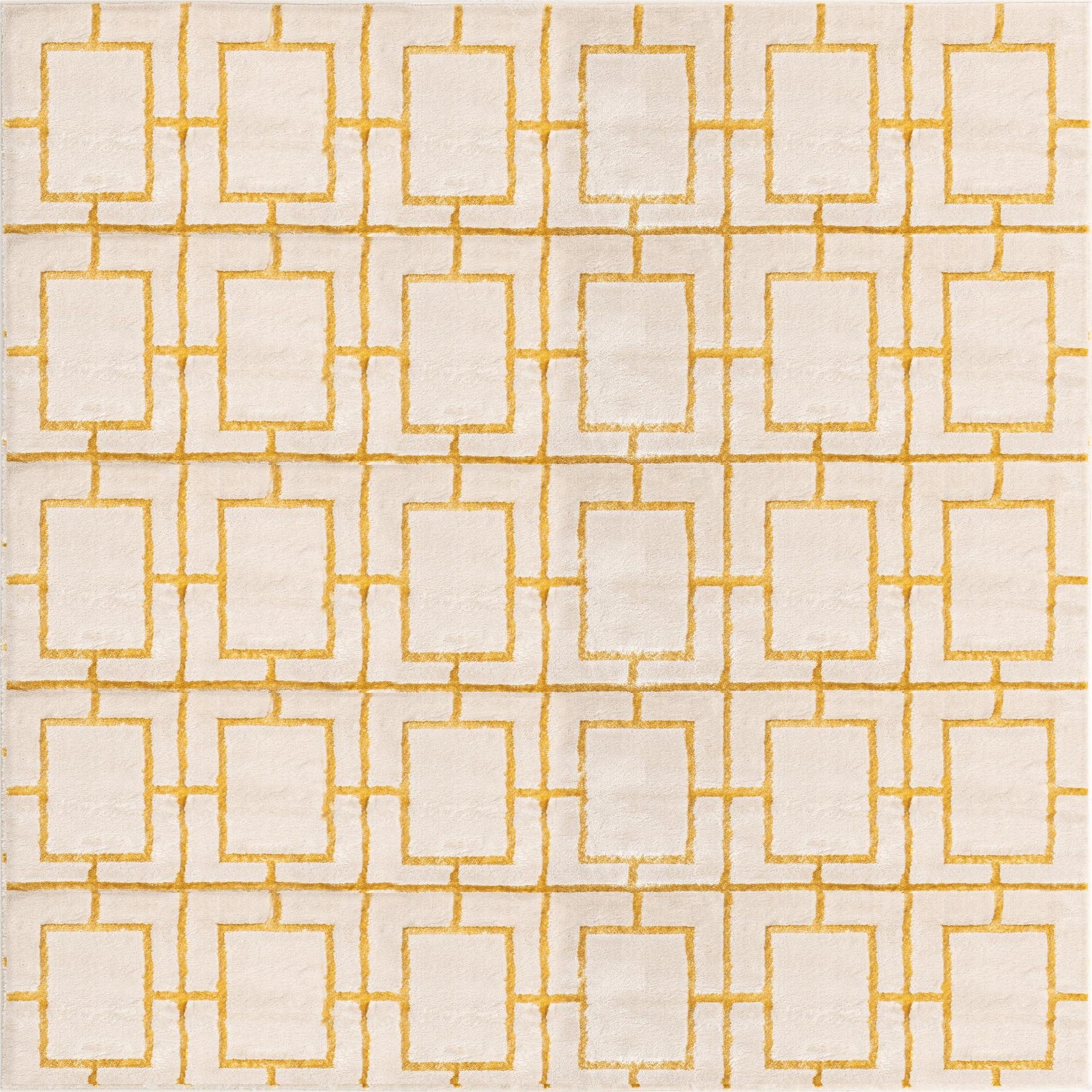 A square white area rug with a textured, high pile, featuring a repeating gold trellis pattern.