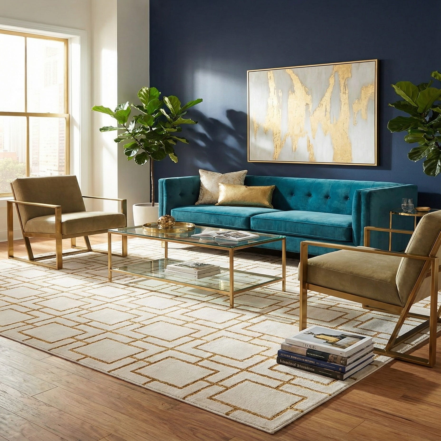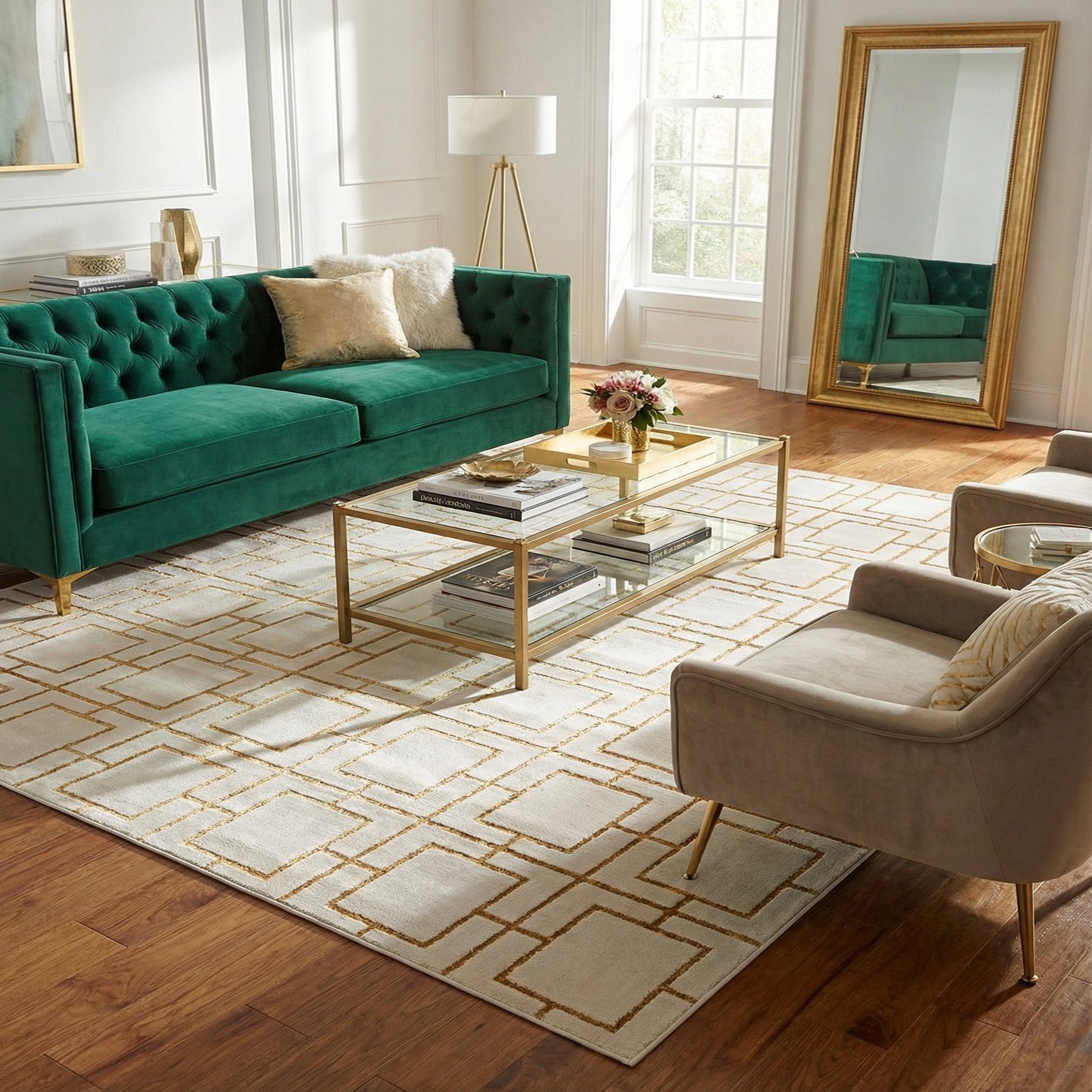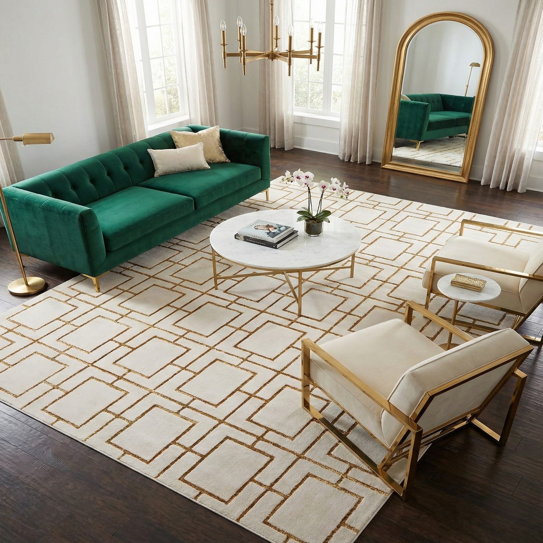 This rug pairs well with modern and transitional interiors—place it beneath a coffee table in a living room to add structure without overpowering the seating area, or anchor a bedroom with neutral bedding and brass or gold accents. It also suits a dining space or home office where geometric order complements mid-century modern or contemporary furnishings, and it coordinates nicely with warm wood tones, mirrored surfaces, and neutral upholstery.
