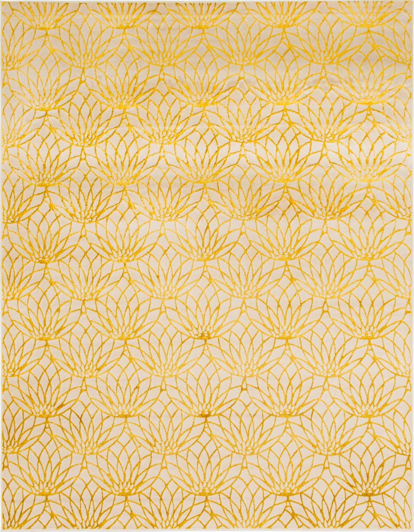 A 9x12 rectangular white area rug featuring a repeating gold floral trellis pattern with a textured pile.
