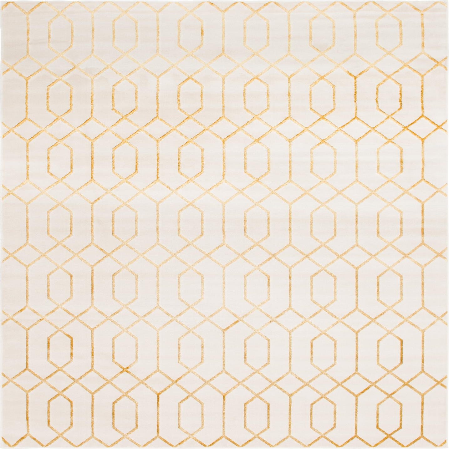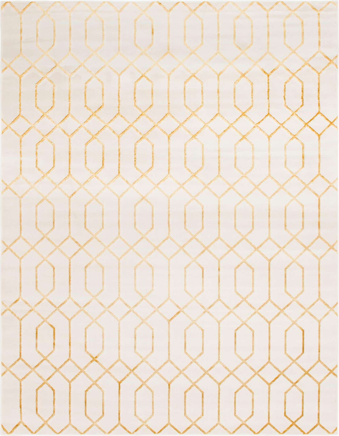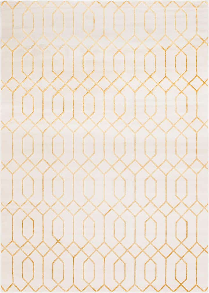 Machine made from 70% polypropylene and 30% polyester, this rug has a low, soft pile with a subtle sheen where the gold pattern is slightly raised, giving a tactile contrast between the smooth background and the patterned areas. Place it under a dining table to brighten a neutral dining space, layer it beneath a living room seating group to unify velvet or leather furnishings, or position it in a bedroom to add a touch of warmth and structure to light-toned bedding and drapery.