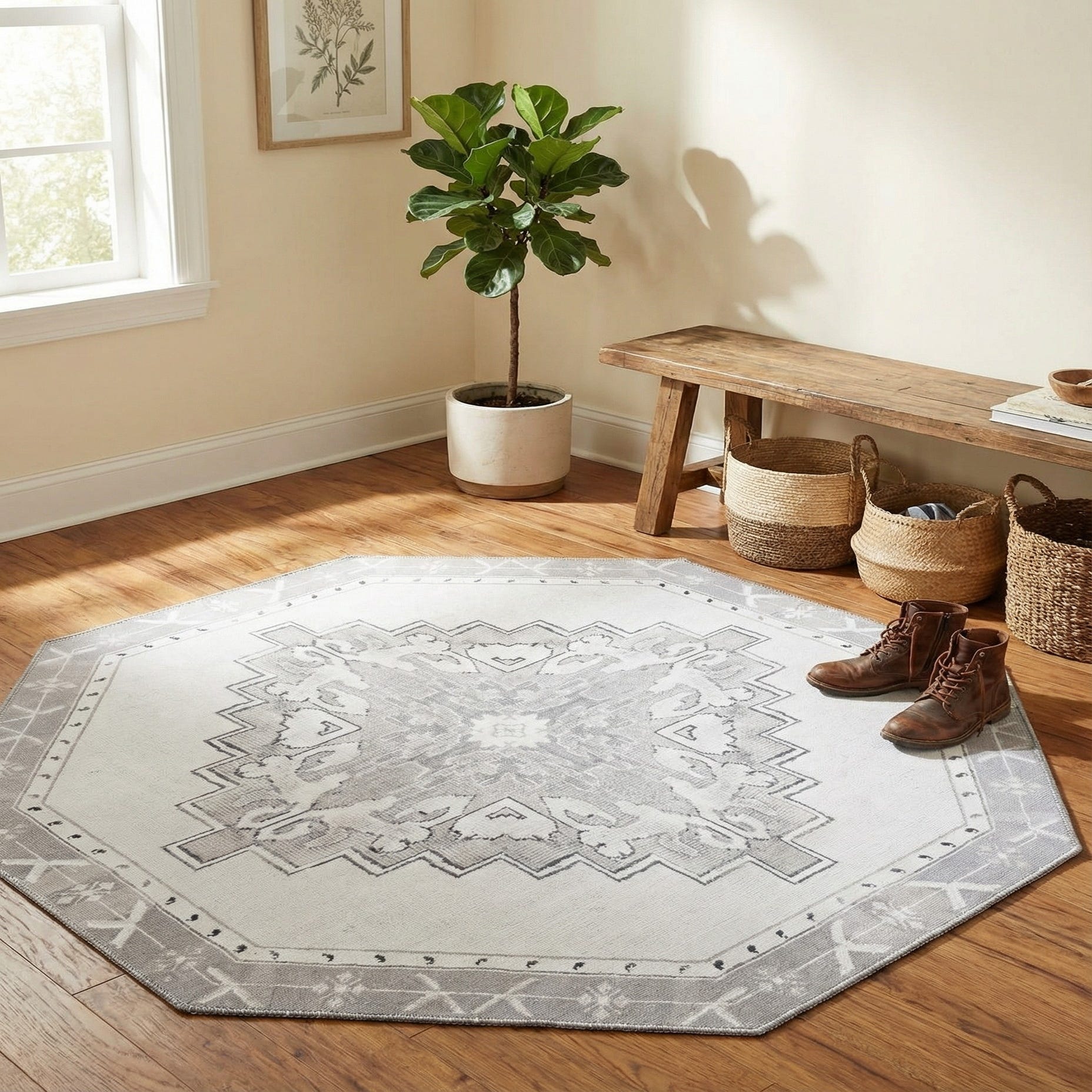 The neutral color palette and graceful pattern make this rug an excellent choice for a variety of interior design themes, from modern minimalist to transitional and even traditional decors. Its octagonal shape can serve as a focal point in a seating area, under a dining table, or in an entryway, adding visual interest and defining the space with style.
