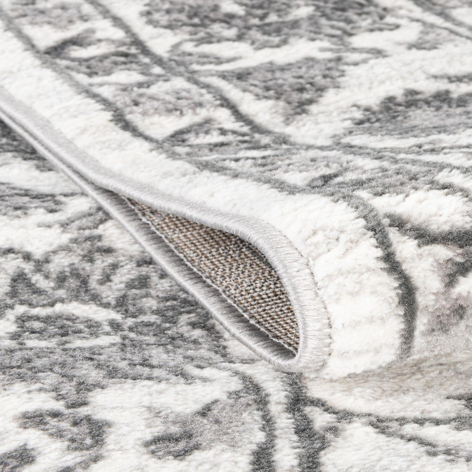 White and gray 8 ft runner rug with a traditional botanical pattern and a textured pile, perfect for a hallway.