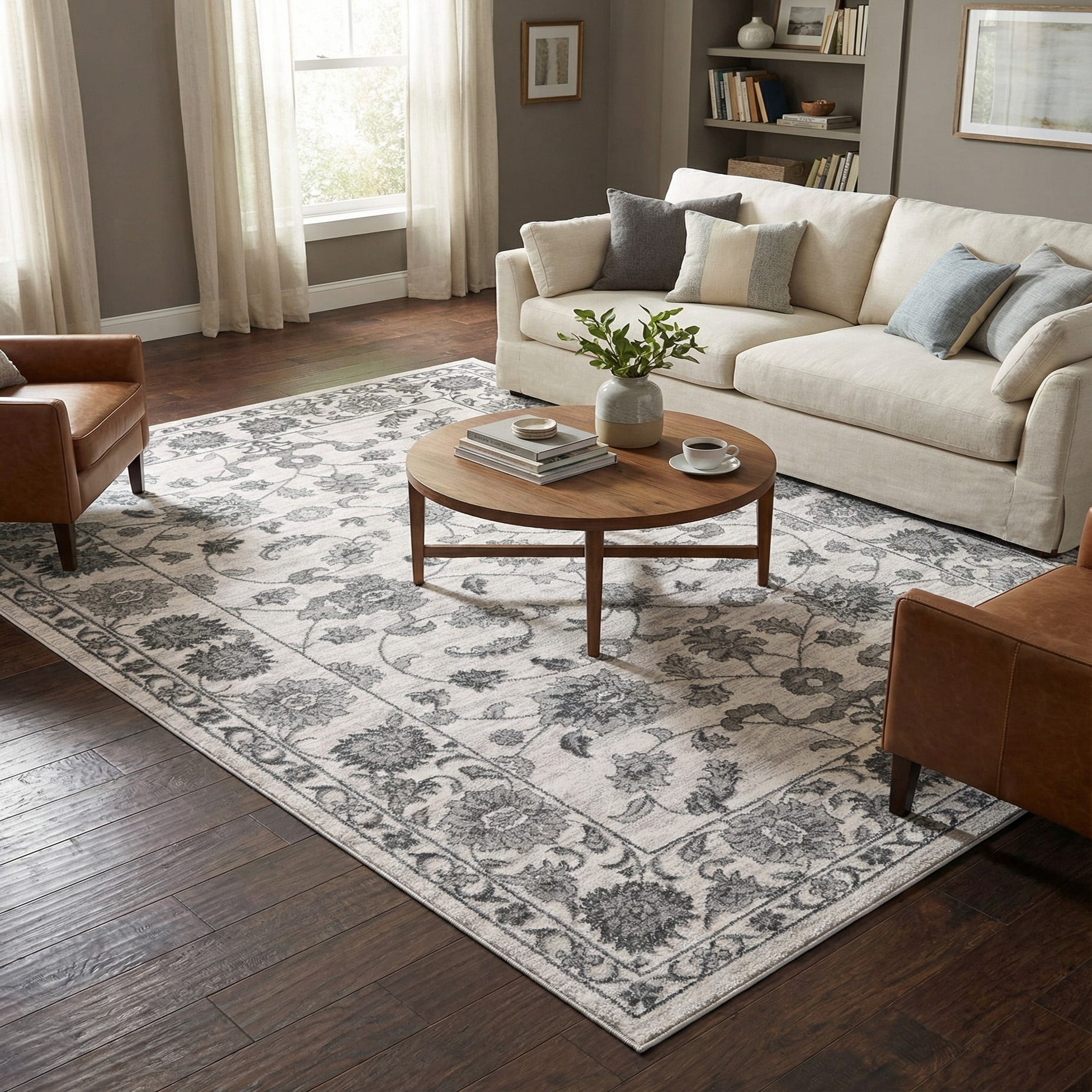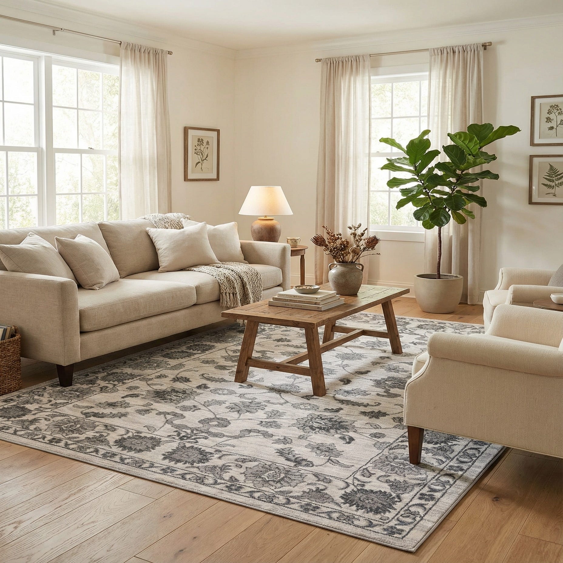 The neutral palette and timeless pattern make this rug well-suited to transitional interiors where classic details meet contemporary furnishings. Use it to anchor a living room seating group, beneath a dining table to introduce soft pattern without competing with other elements, or layered at the foot of a bed to add warmth and texture. It pairs easily with warm wood tones, painted furniture in soft neutrals, or streamlined metal accents for a calm, cohesive room.