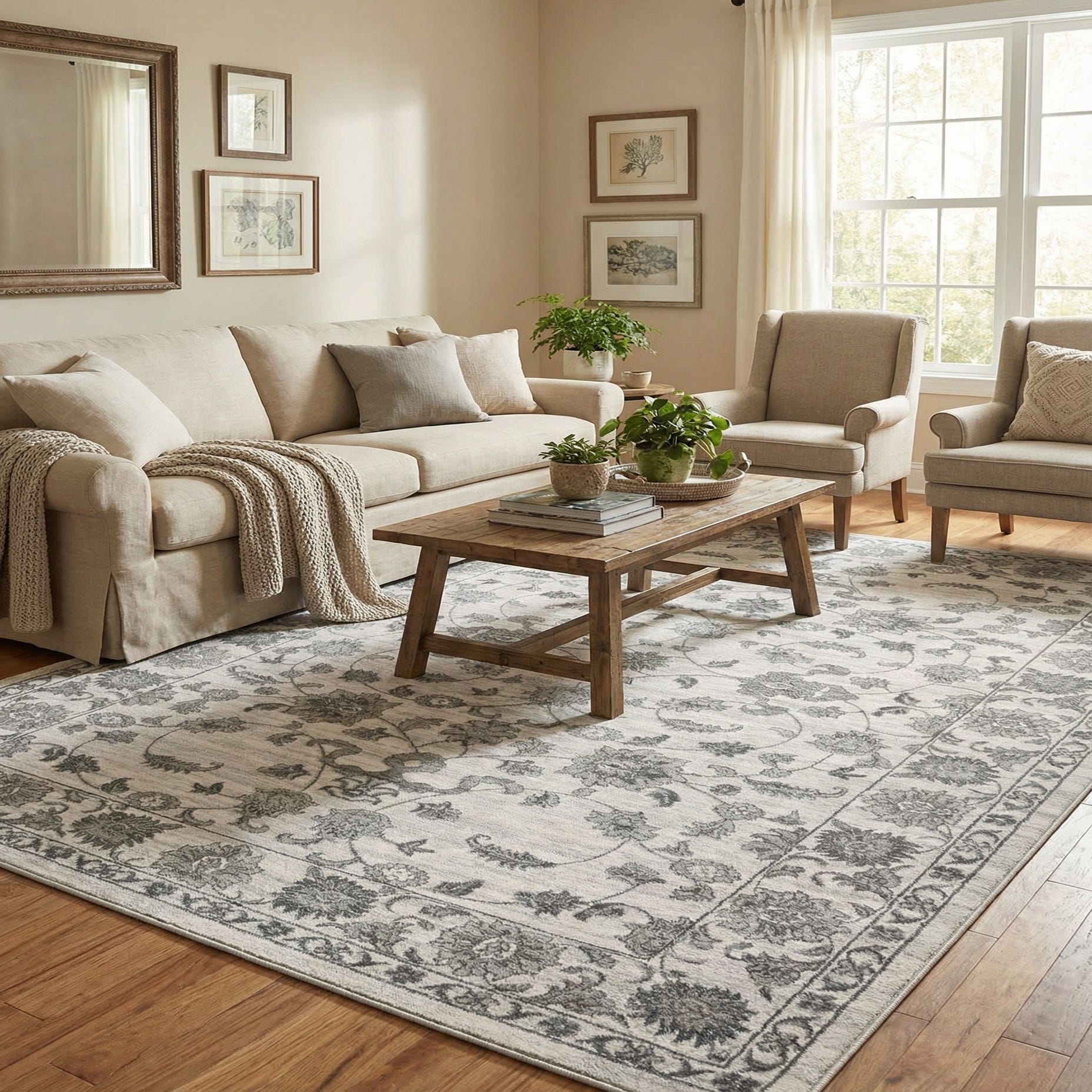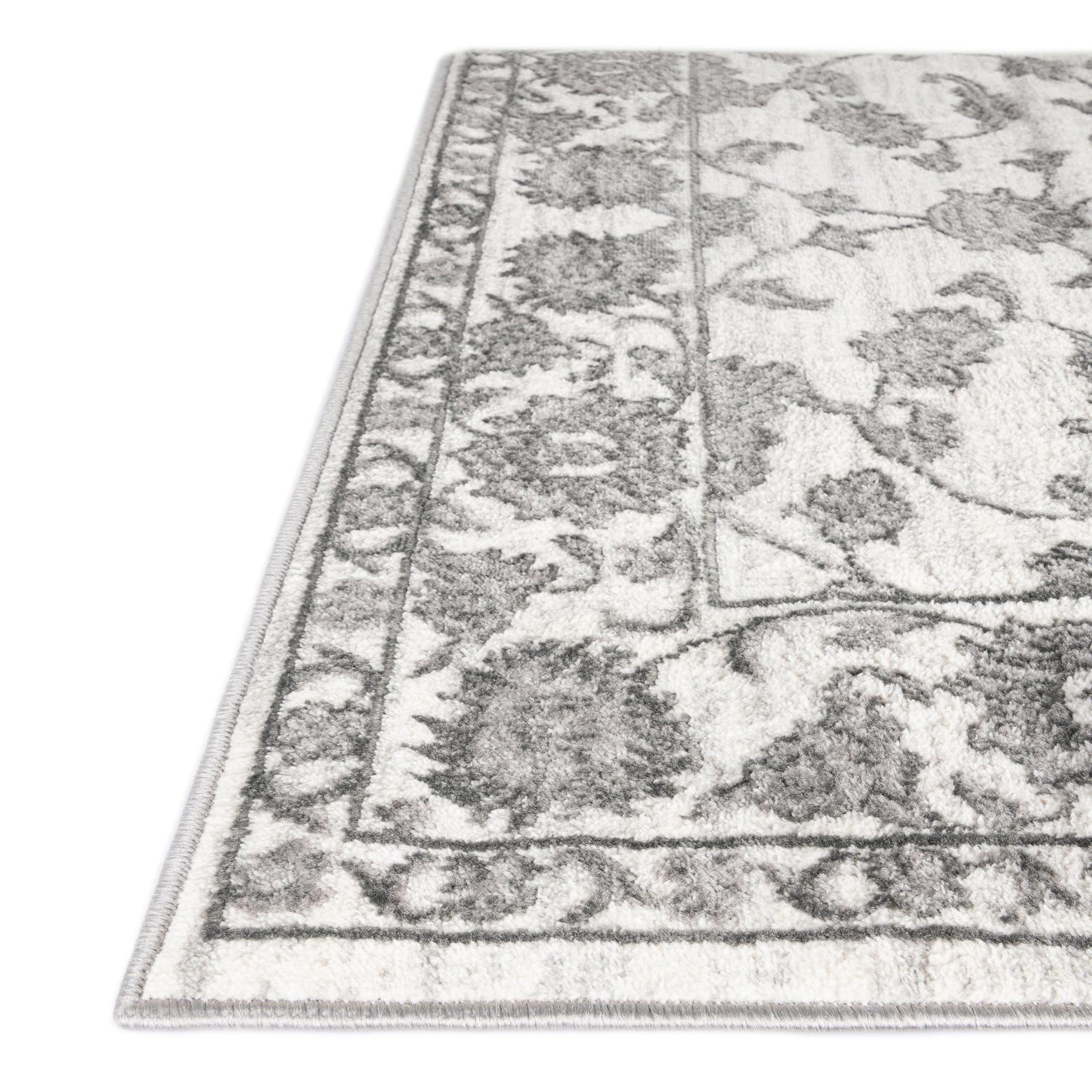 A classic floral-and-vine pattern is laid out across a white-gray ground, framed by a narrow floral border in coordinating tones. Ivory highlights and soft gray detailing form the stylized medallions and scrolling foliage, giving the rug a refined, balanced look that pairs traditional motifs with a fresh, neutral palette. The pattern is detailed without feeling busy, so it brings visual interest while maintaining a calm overall effect.