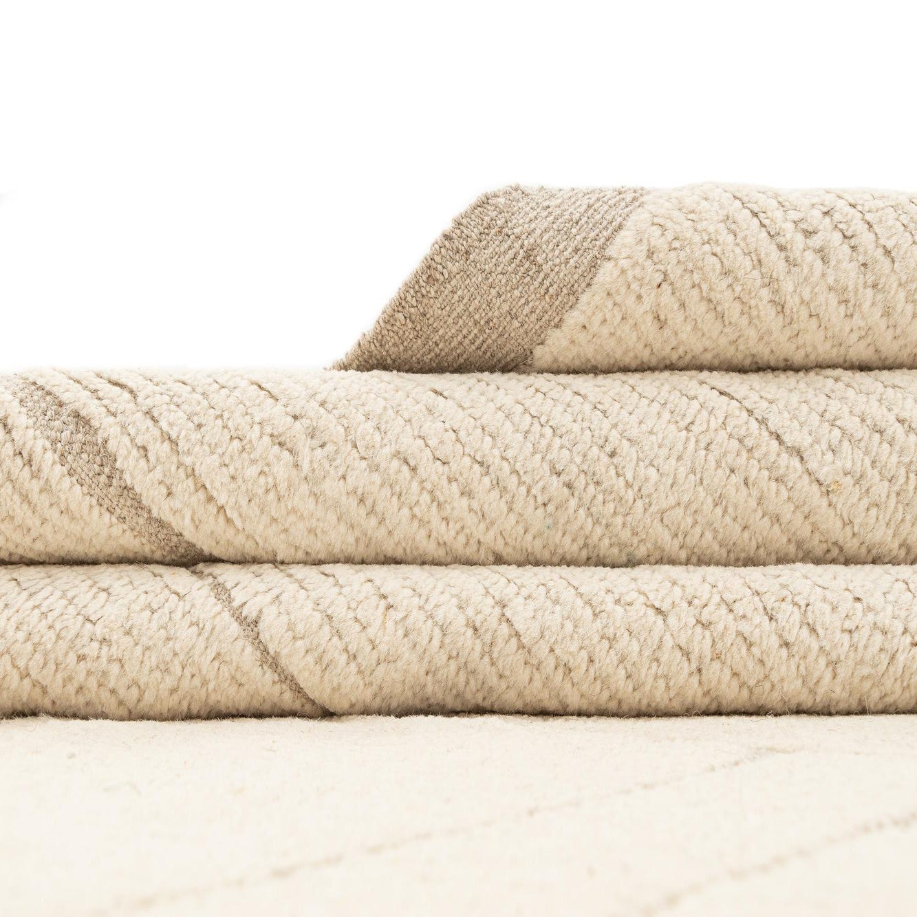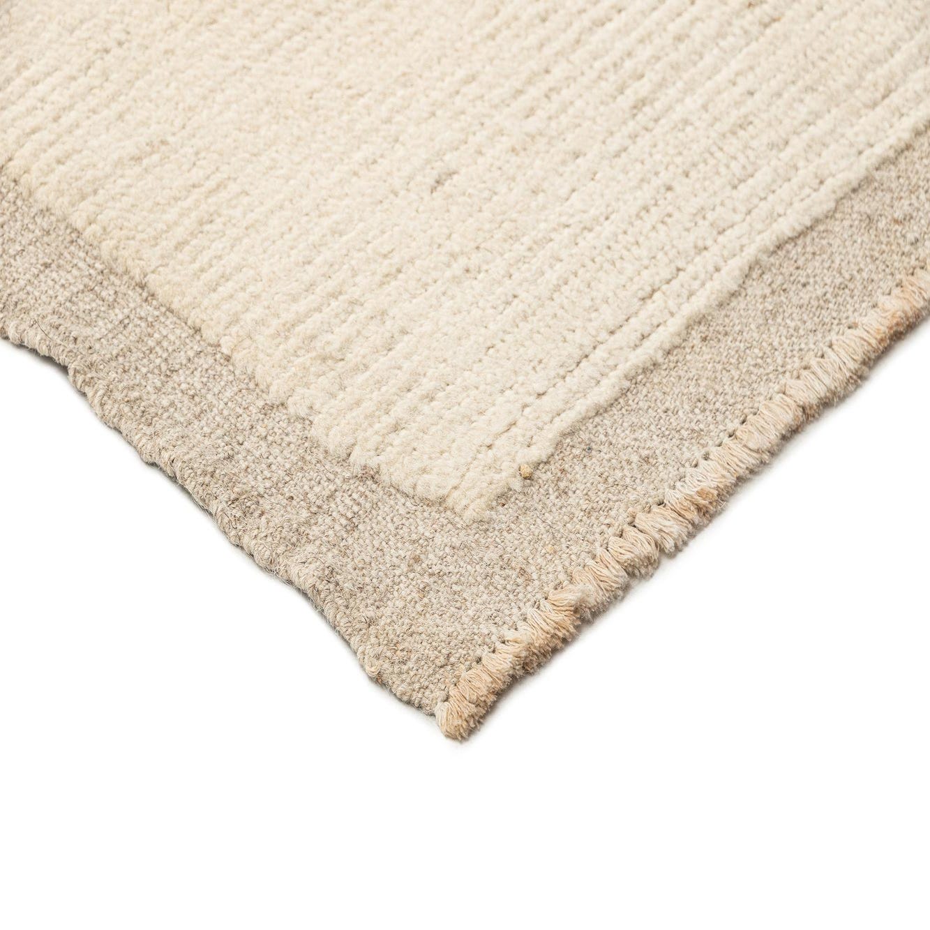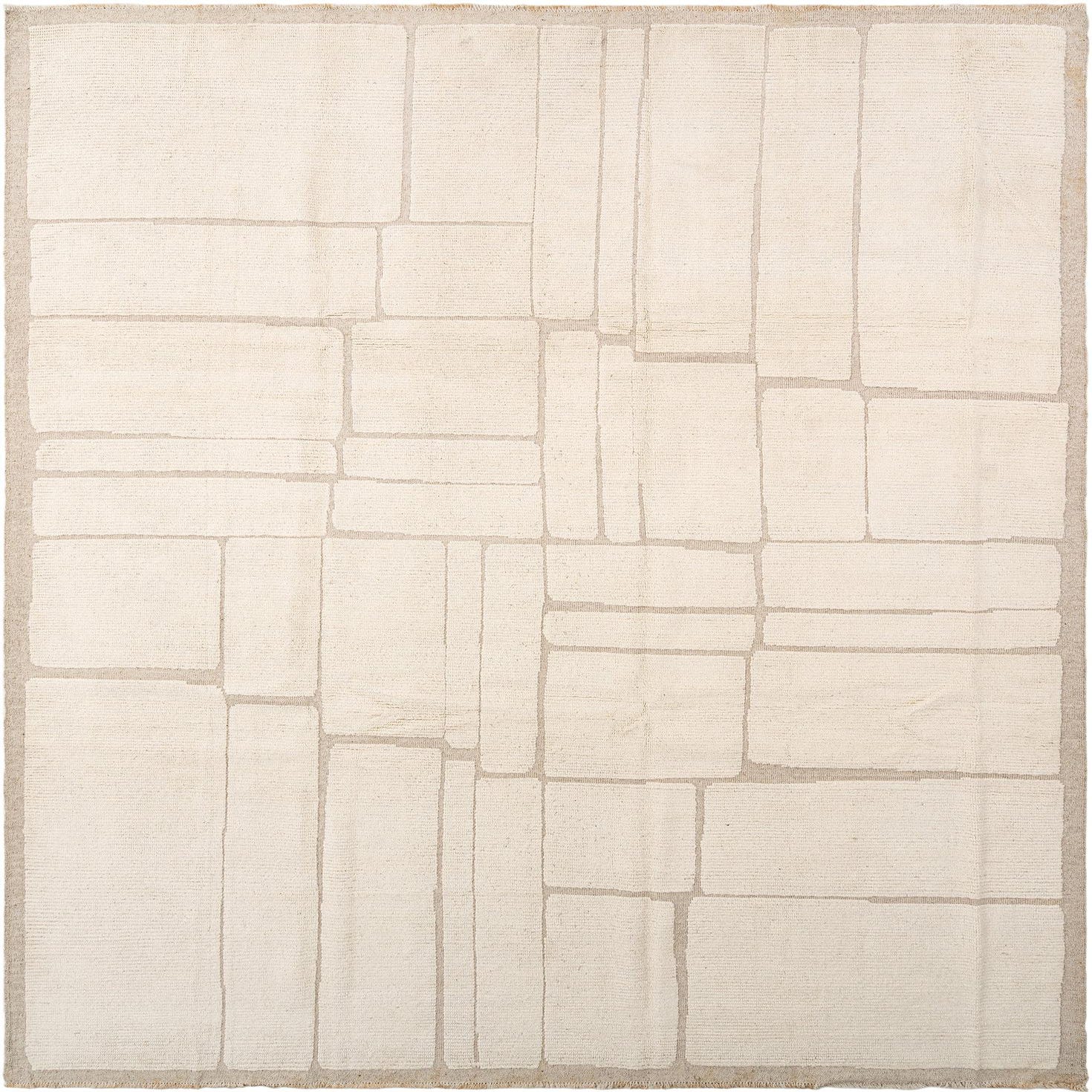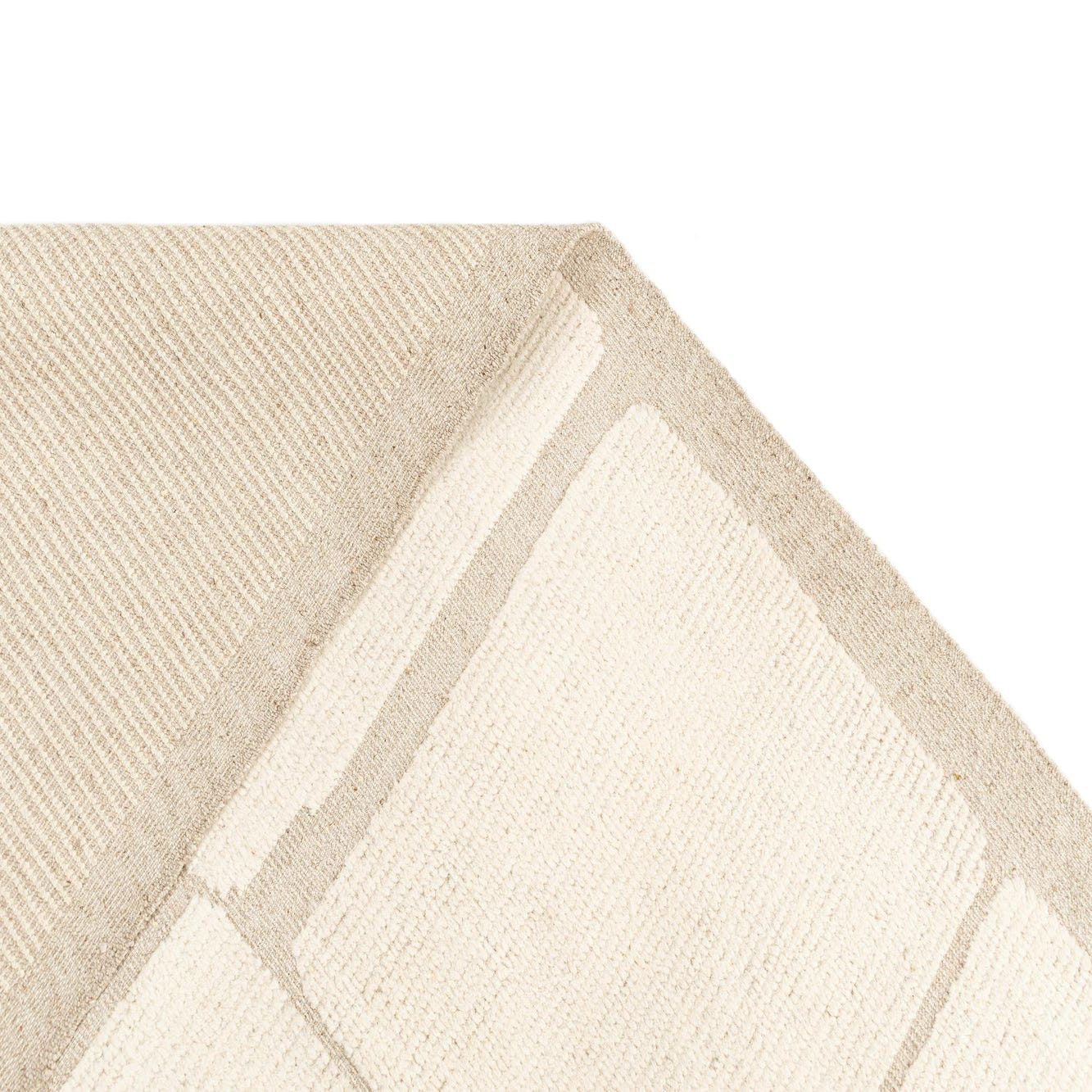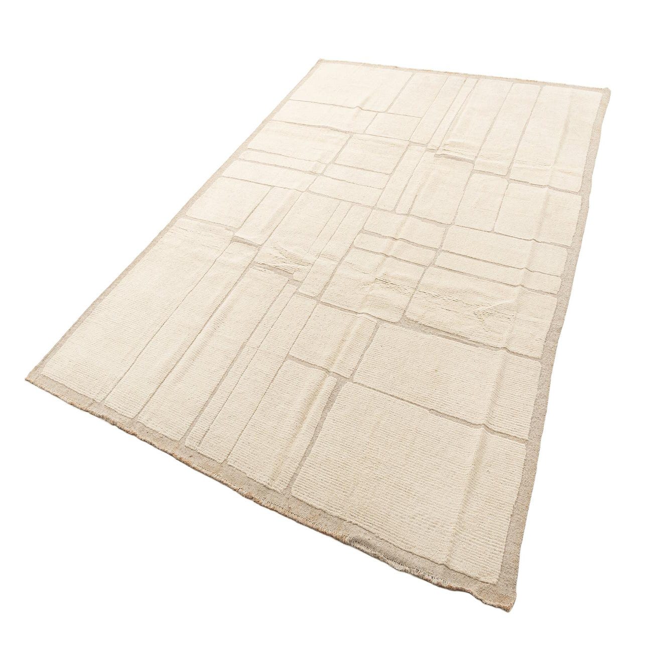 A handmade rectangular Beni Marok rug in shades of white, featuring a modern Persian-inspired geometric pattern.