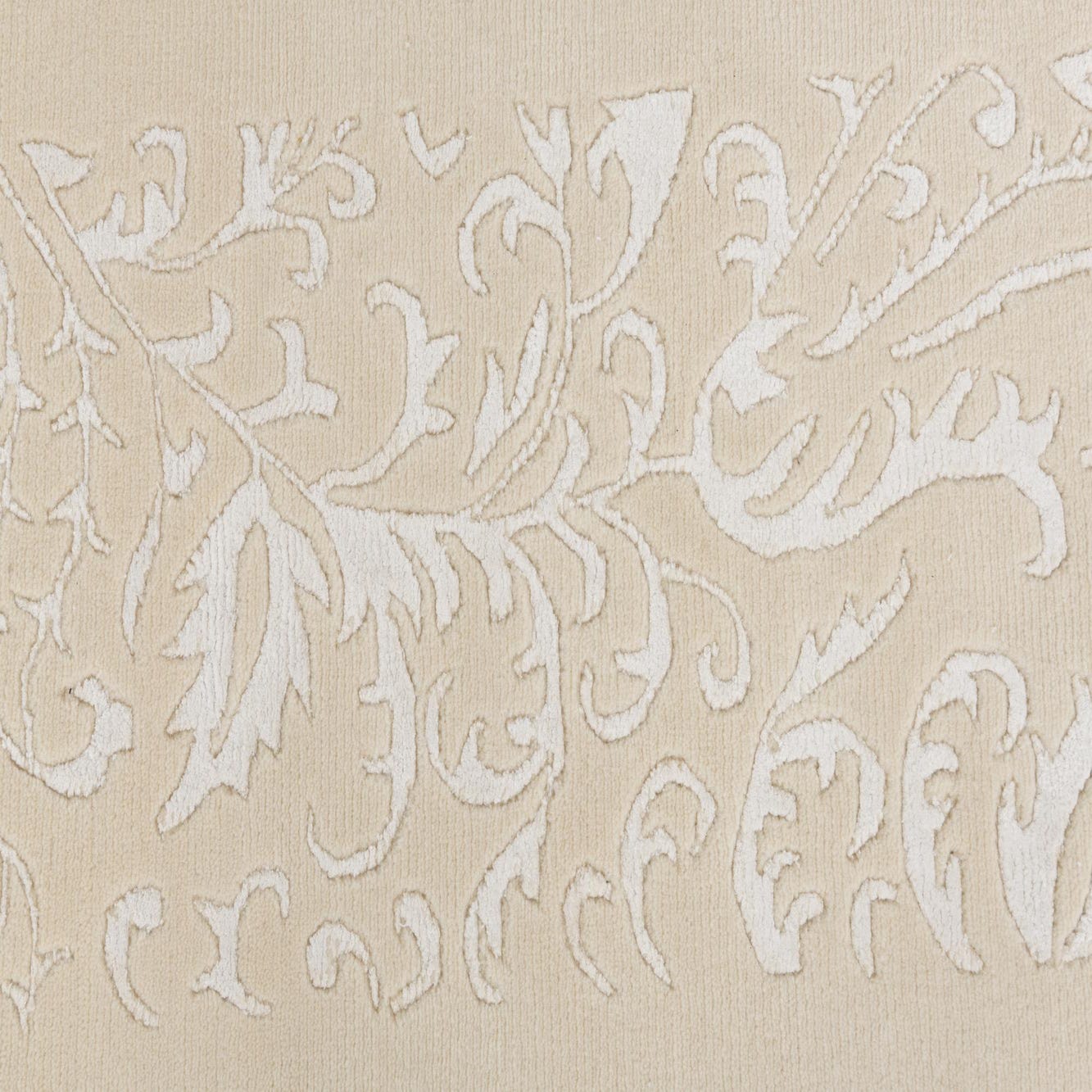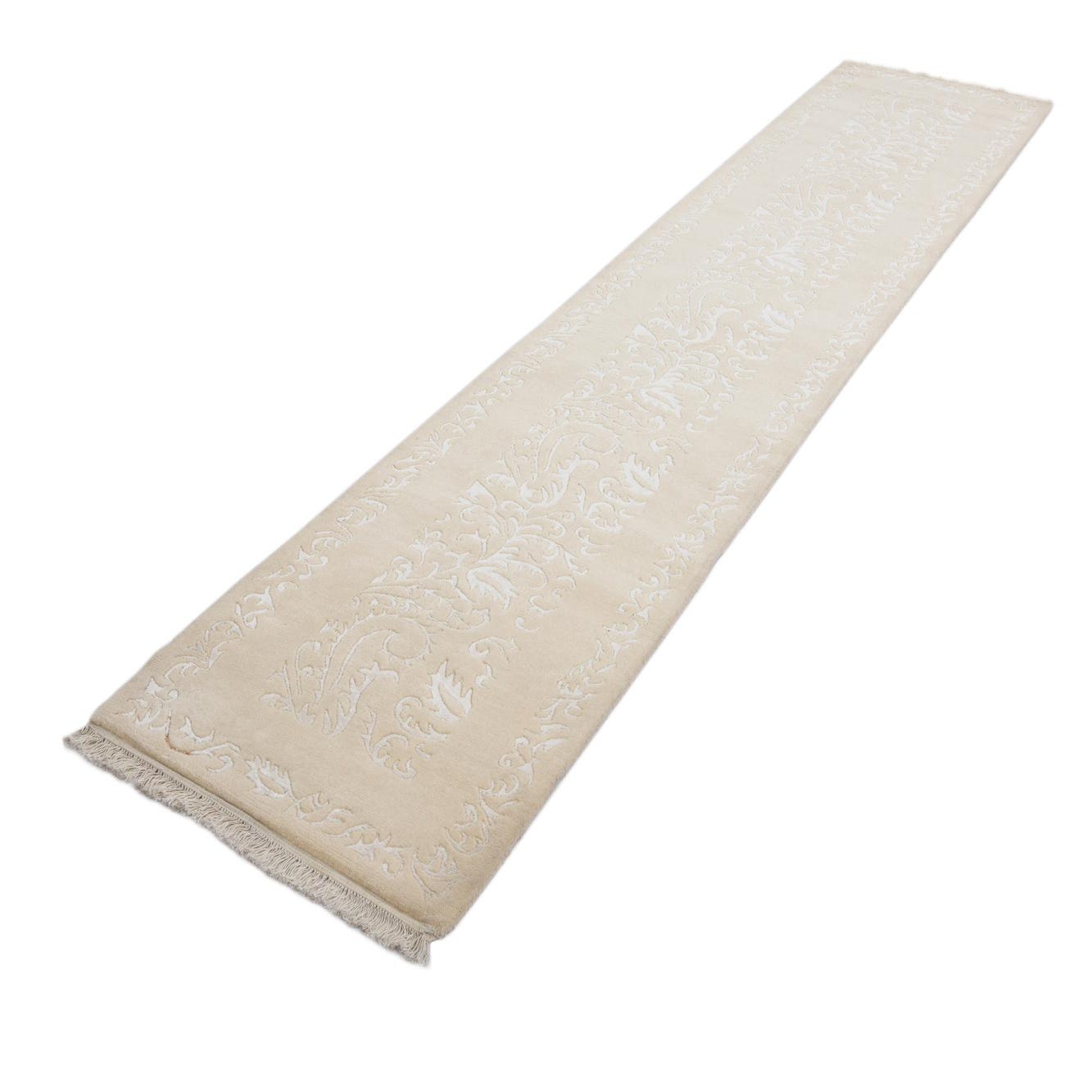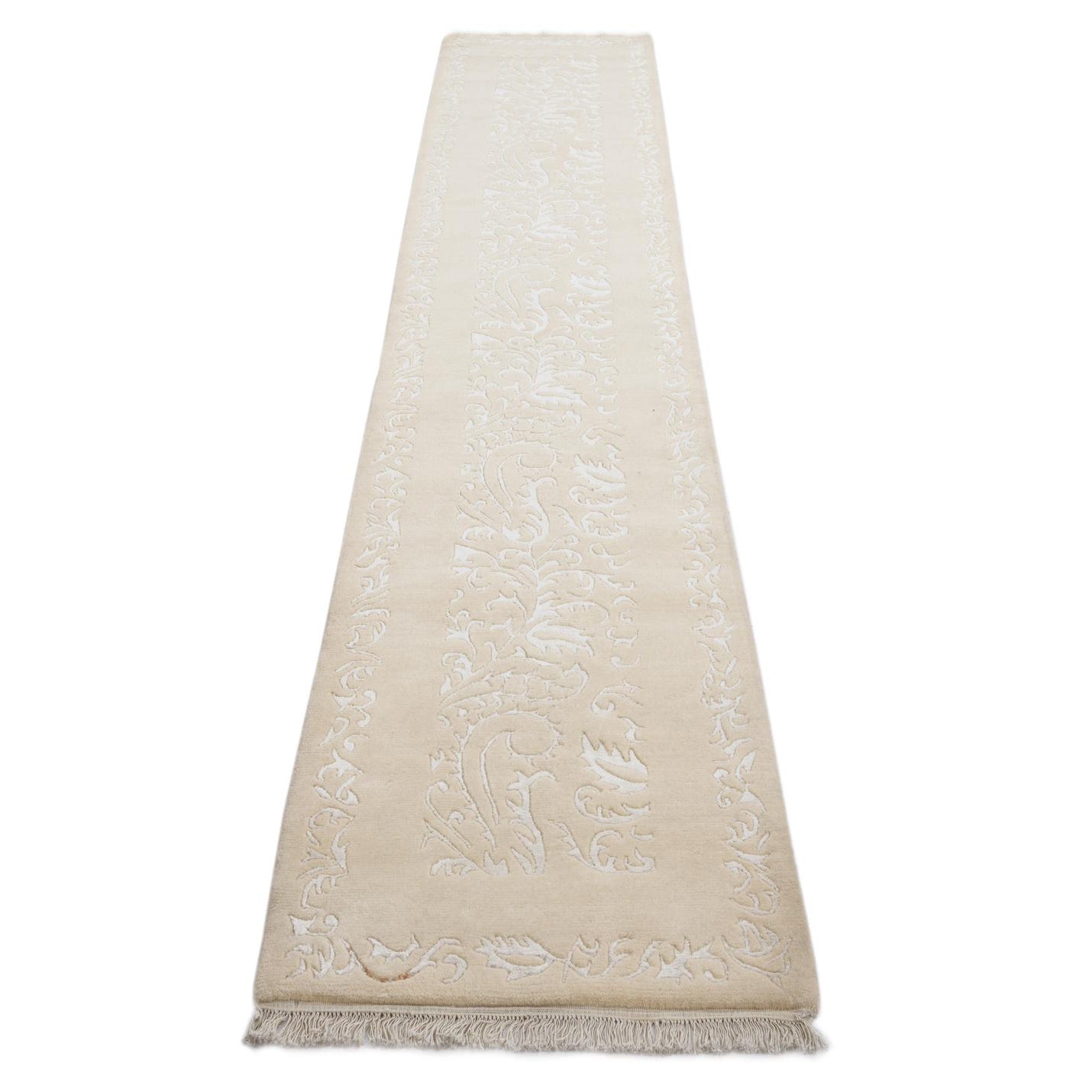 The Darya collection 13 Ft Runner is a hand-knotted rug crafted from 100% wool, known for its durability and natural texture. This rug features a White Ivory background with a subtle raised Ivory pattern, presenting a sophisticated tonal design. The pattern consists of elegant scrolling motifs, reminiscent of classic architectural details, which brings a sense of traditional charm.