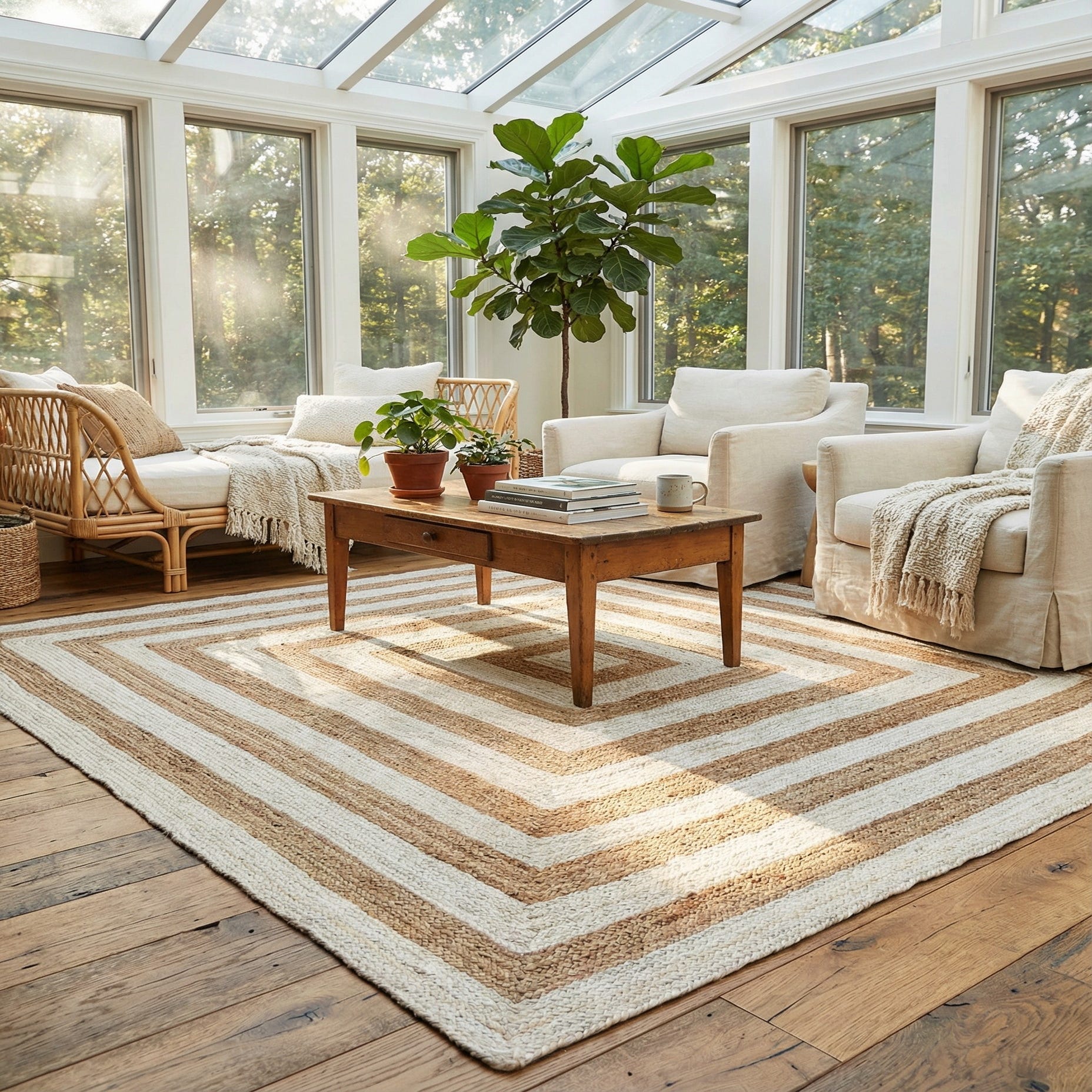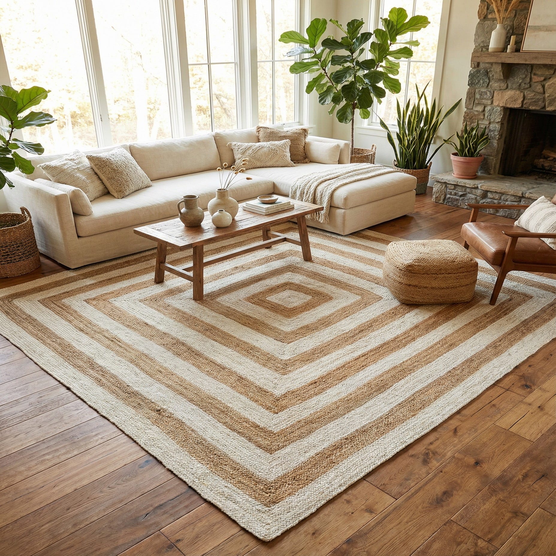 The Braided Jute collection offers a hand-braided rug constructed from 100% natural jute fibers, ensuring a durable and sustainable choice for your home. This 10-foot square rug presents a harmonious blend of natural tones in a geometric, concentric square pattern. Its background color is White Natural, which is complemented by alternating bands of subtle, earthy shades that contribute to its sophisticated and contemporary appeal.