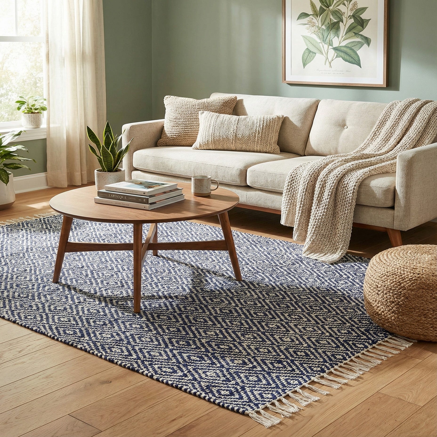 A 5x8 rectangular white and navy flatweave rug with a geometric diamond pattern and fringed edges, suitable for a living room.