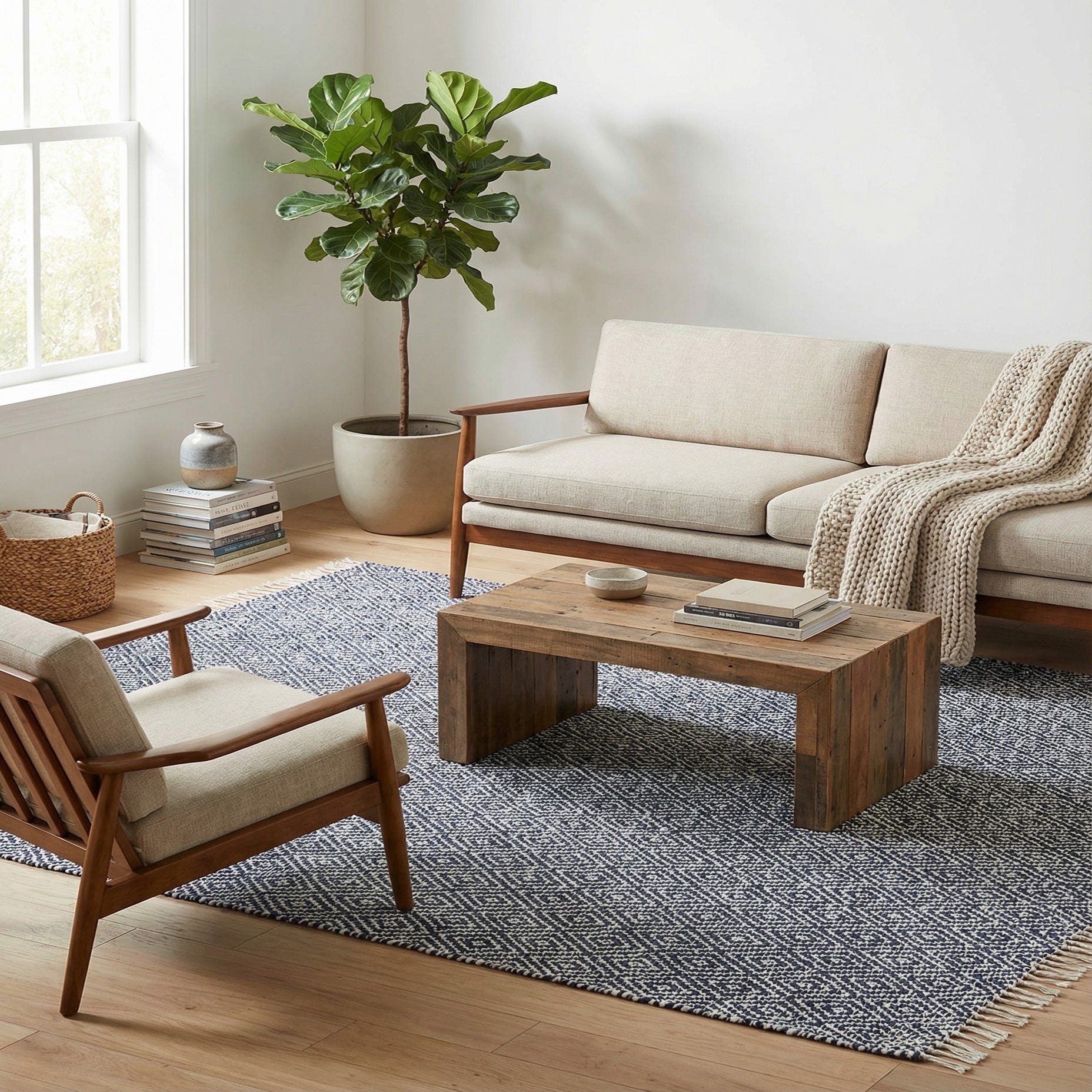 This rug works well in relaxed, coastal-inspired rooms, modern farmhouse spaces, or minimalist interiors that benefit from a bit of pattern. Place it beneath a coffee table in a living room, under a dining table to add definition, or in an entryway to set a welcoming tone — it pairs naturally with light woods, white linens, and navy or brass accents.