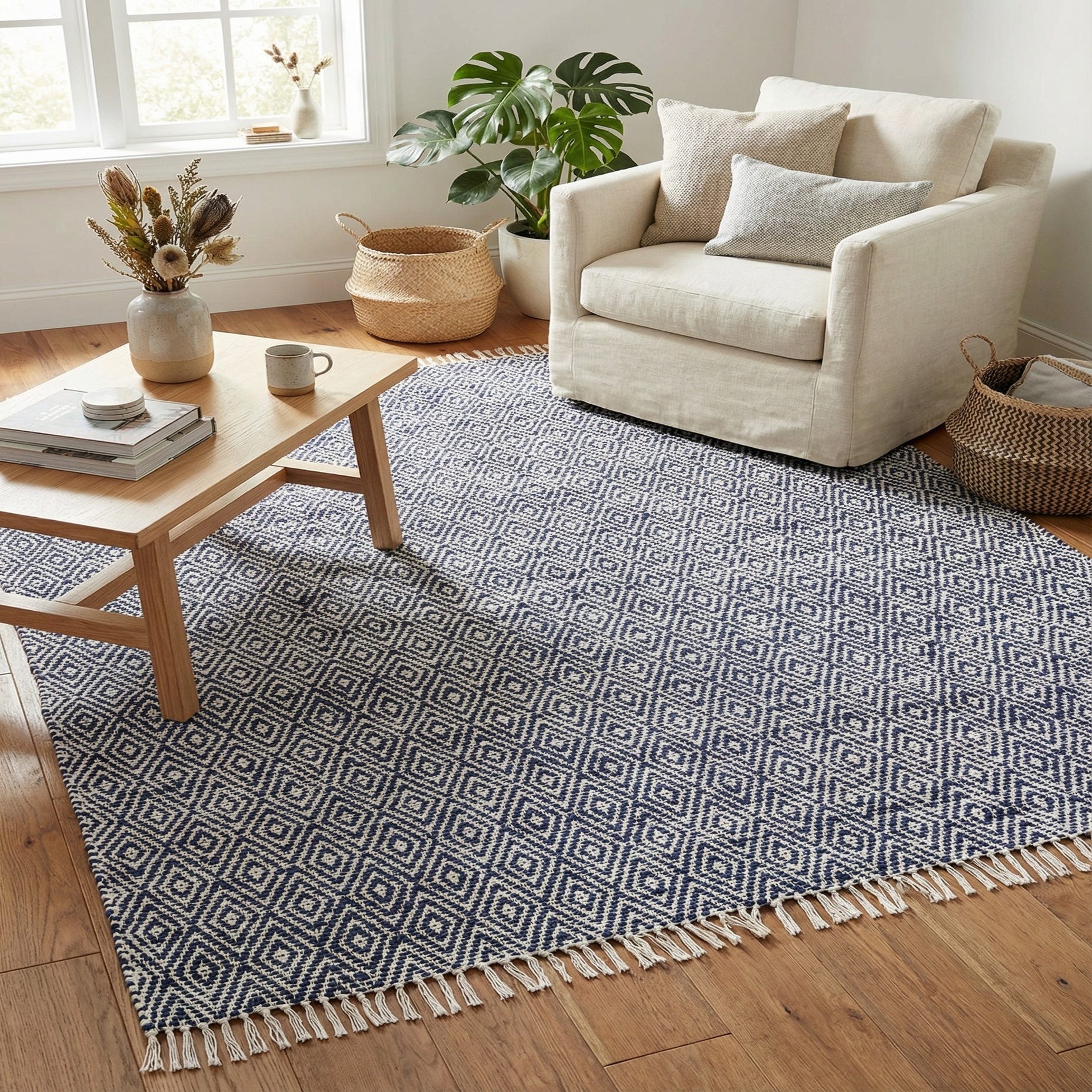 Hand-woven from a blend of 60% jute and 40% cotton, this flatweave rug pairs a crisp white ground with a navy geometric diamond motif for a clean, structured look. The repeating diamond pattern creates visual depth without heaviness, and the subtle variations in the weave give the surface a tactile, slightly slubby texture. Short fringed ends add a casual, handcrafted touch while the low-profile construction keeps the rug feeling grounded and easy to layer.