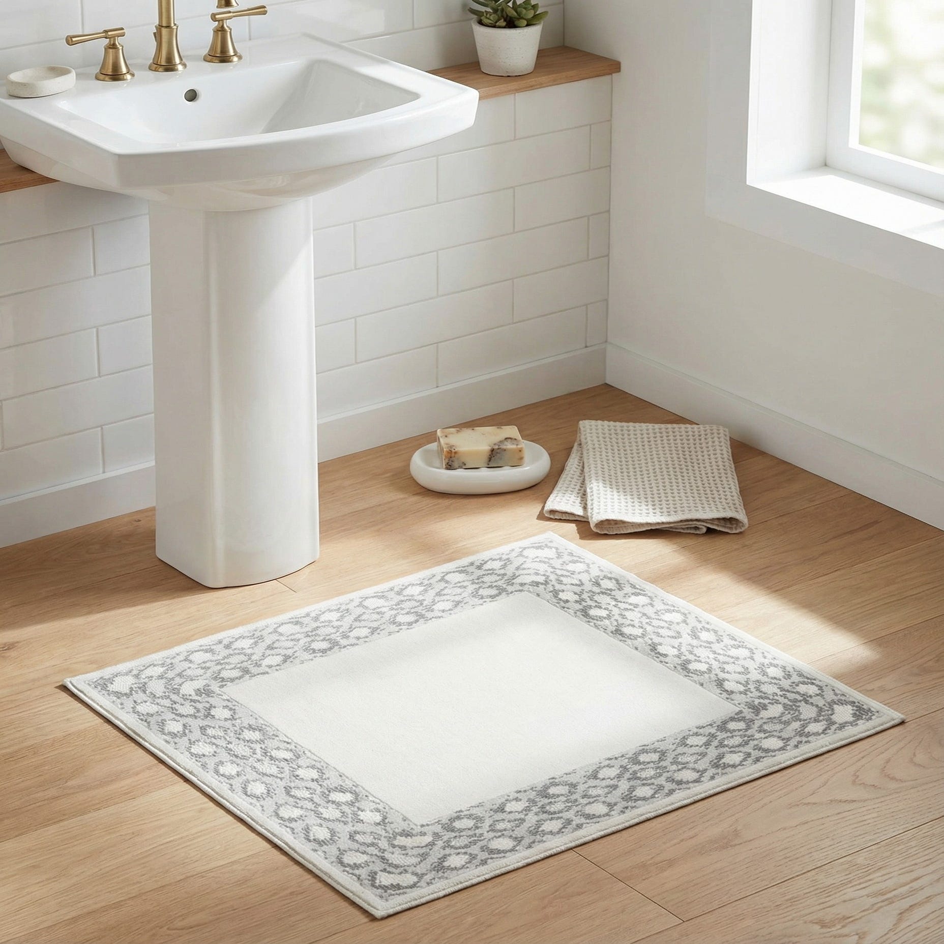 A crisp white field provides a calm, open surface framed by an Ivory patterned border that adds understated visual interest. The border carries a repeating geometric motif in tight, small-scale shapes that read like a refined trellis—offering contrast without overpowering the rug’s clean center. Machine made from 60% polypropylene and 40% polyester, the central area has a smooth, low-profile feel while the border presents a slightly textured, woven look that adds depth underfoot.