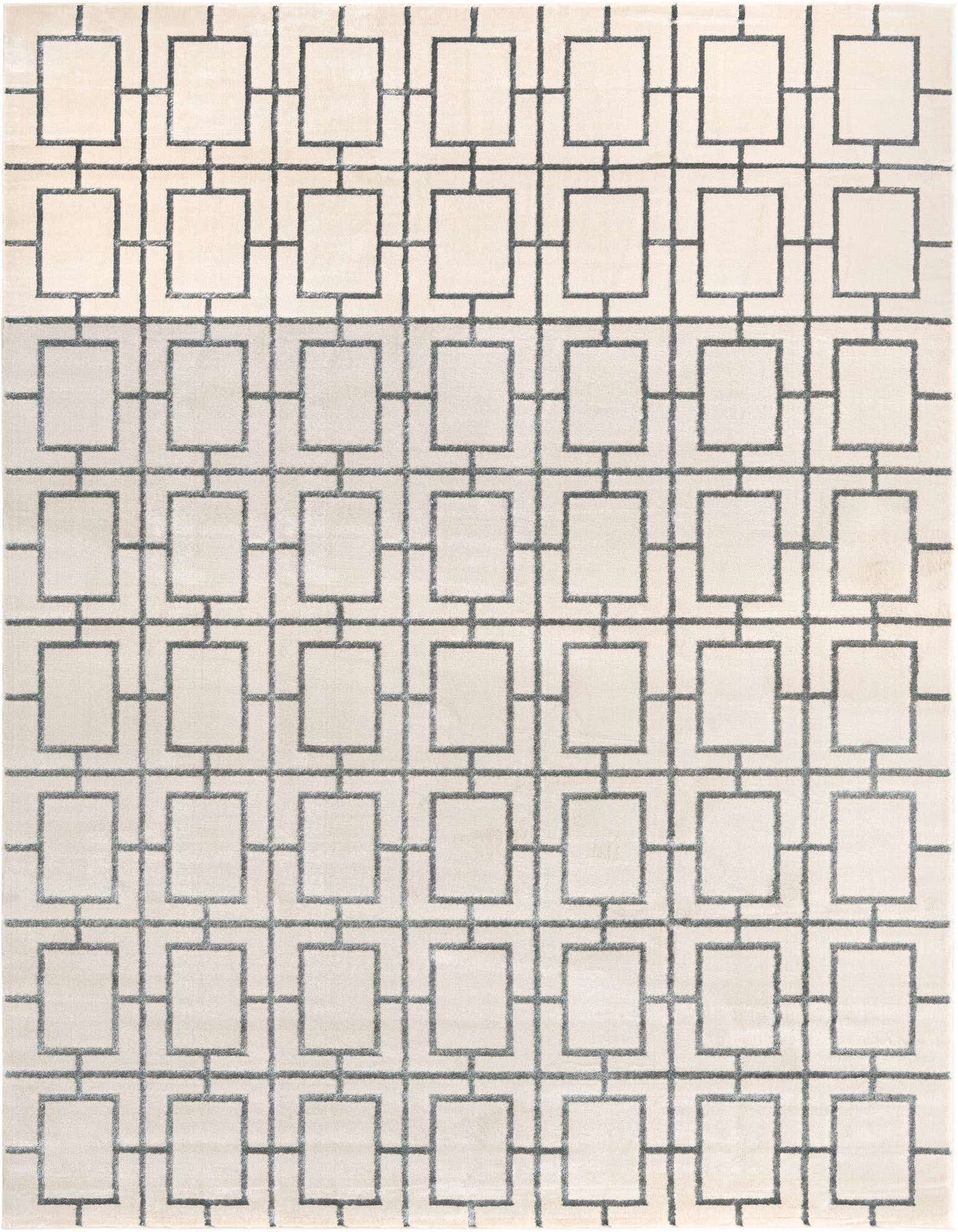 A 10x13 rectangular Marilyn Monroe Glam Trellis rug in white with a gray modern geometric trellis pattern, ideal for a living room.