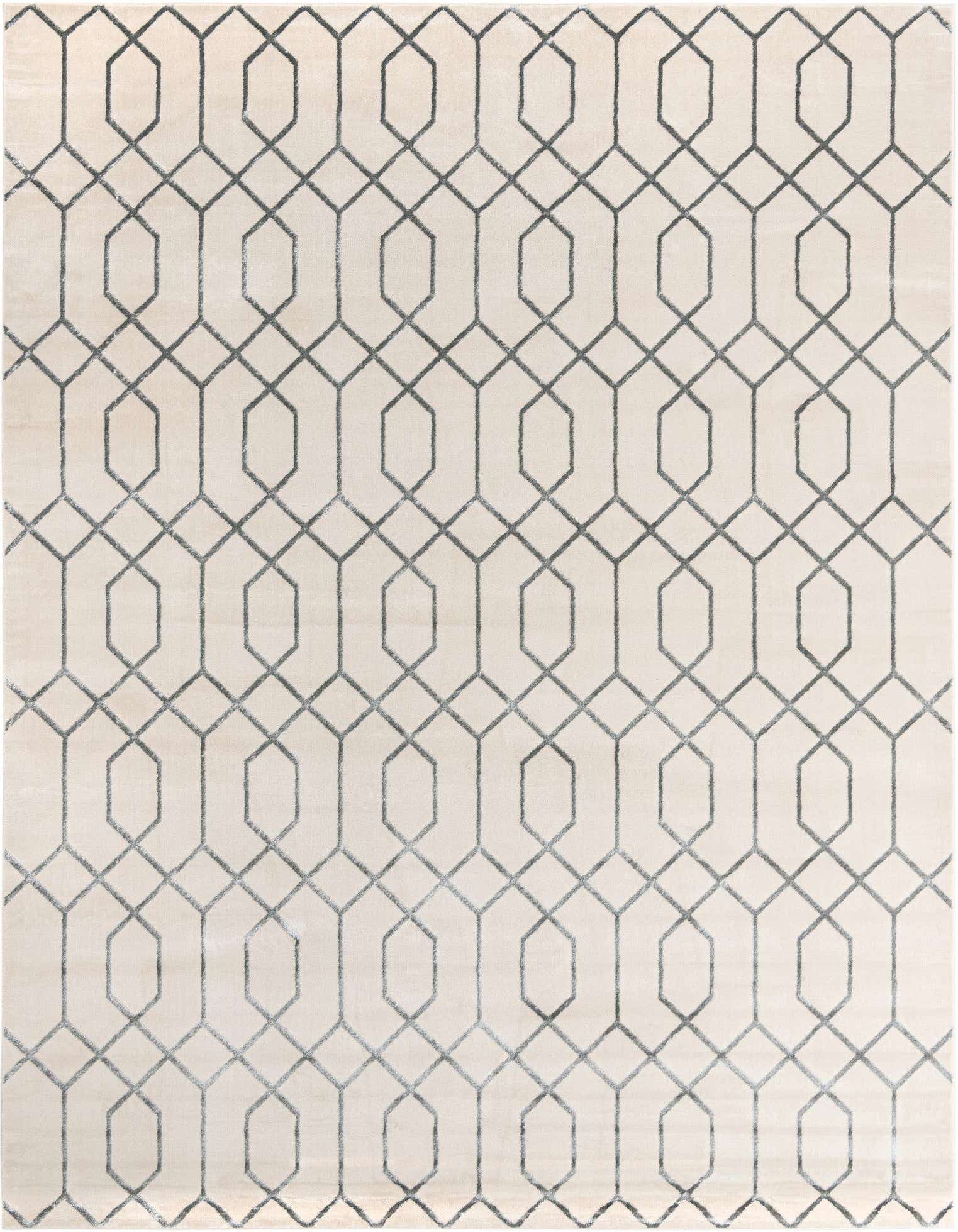 A 10x13 rectangular Marilyn Monroe Glam Trellis rug featuring a modern gray geometric trellis pattern on a white background.