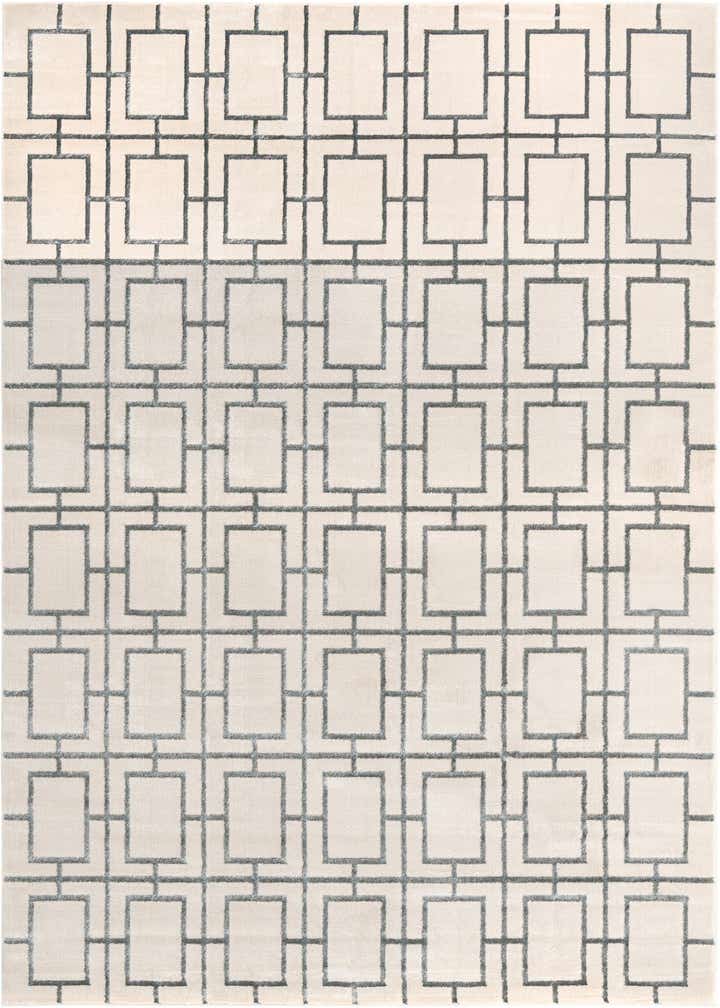 A crisp geometric trellis of linked rectangles sits on a White Silver background, rendered in clean Silver lines that create a structured, modern grid. The repeating rectangular motif gives a contemporary, slightly retro nod to mid-century patterns while keeping the overall look restrained and orderly. Machine made of 70% polypropylene and 30% polyester, the pile is low and dense to the touch, offering a smooth, slightly lustrous surface where the polyester fibers catch light and the polypropylene provides a soft, even feel underfoot.