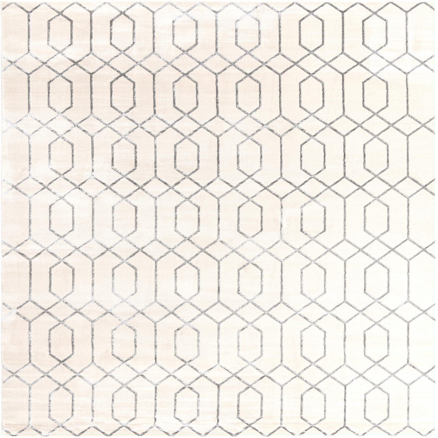 A crisp geometric trellis pattern of elongated octagons and interlocking lines lays across a White Silver ground, with the design rendered in a cool Silver hue for a clean, modern look. The pattern reads contemporary with a hint of glam thanks to the metallic-like sheen in the silver fibers, while the soft white-silver background keeps the overall effect light and airy. The surface has a low, plush hand that invites bare feet—polyester lends a subtle luster to the pattern while polypropylene gives the field a smooth, resilient feel.