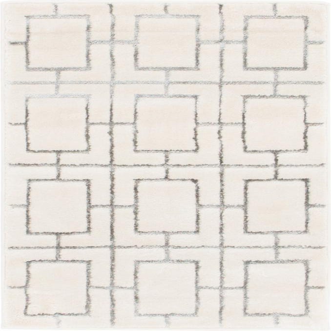 A white-silver field forms the calm backdrop for a modern trellis of rectangular motifs outlined in silver. The linked rectangles create a clean, architectural pattern with slightly softened edges that lend a hand-drawn quality to the design. Machine made from 70% polypropylene and 30% polyester, the rug has a low-profile, softly plush texture you can feel underfoot; the polyester yarns add a gentle sheen that contrasts with the matte white-silver ground for a subtle, refined look.