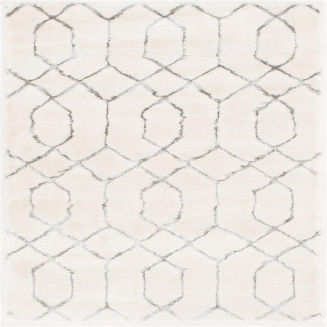 A soft White Silver ground is patterned with a delicate silver trellis of linked elongated ovals and diamonds, creating a modern, refined lattice that reads clean and open. The pile has a plush, slightly lustrous hand—the 70% polypropylene and 30% polyester construction gives the surface a smooth, cushioned feel with a subtle sheen that catches light on the silver accents. Machine made for consistent texture and pattern, the design balances a contemporary geometric motif with a gentle, tactile softness underfoot.